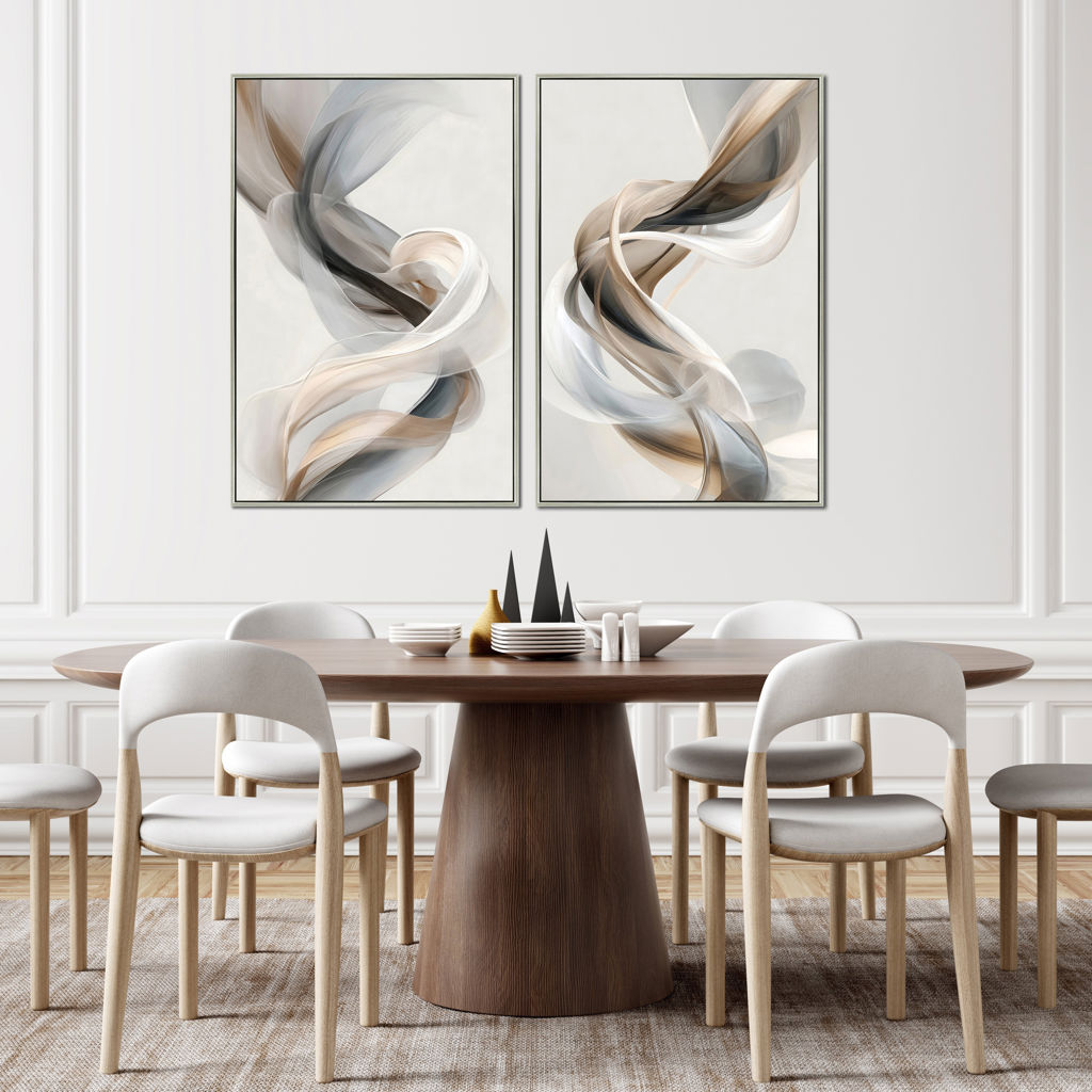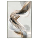 Cette œuvre abstraite évoque le mouvement délicat de rubans soyeux qui se croisent et se déploient dans une palette harmonieuse de beige, blanc, gris et noir.
