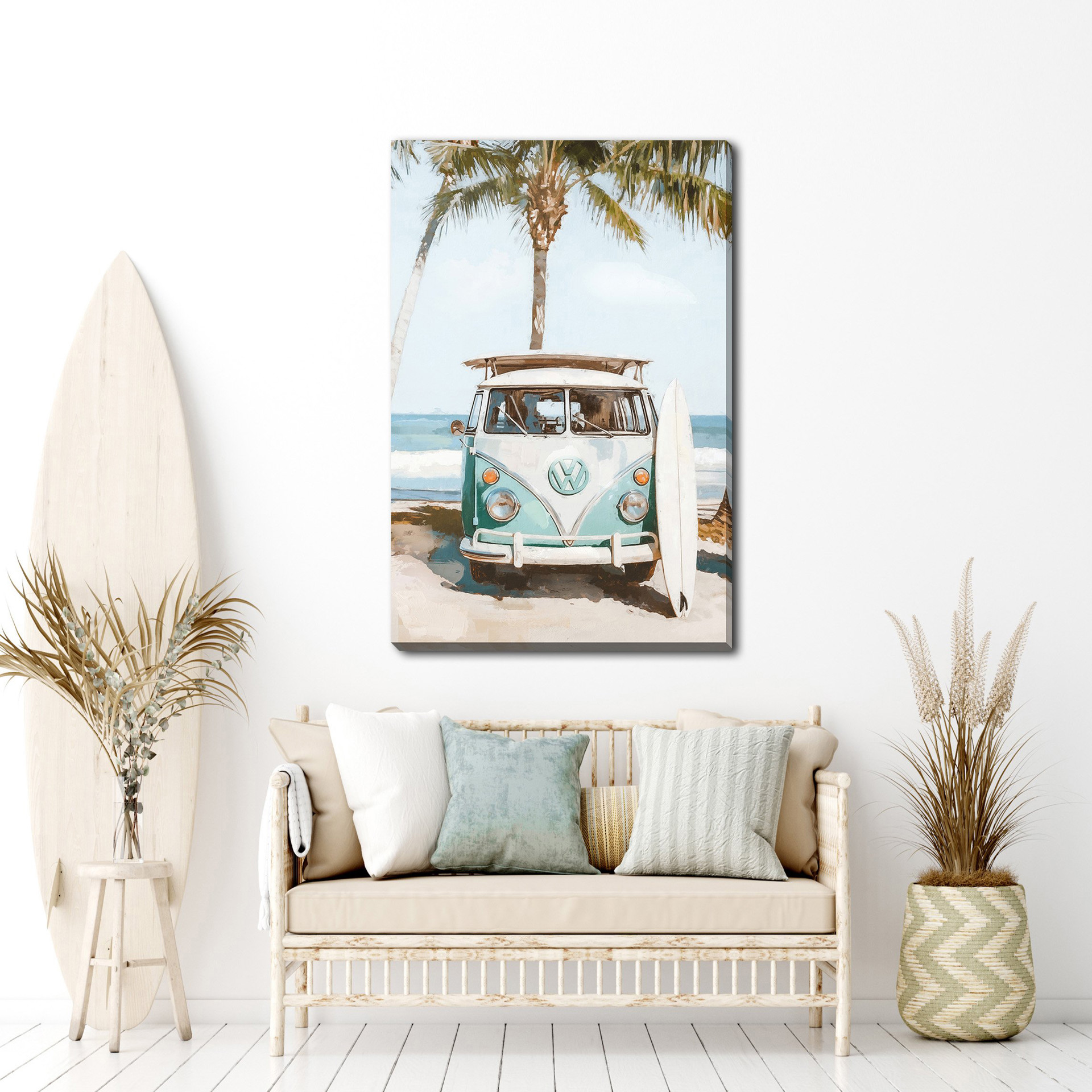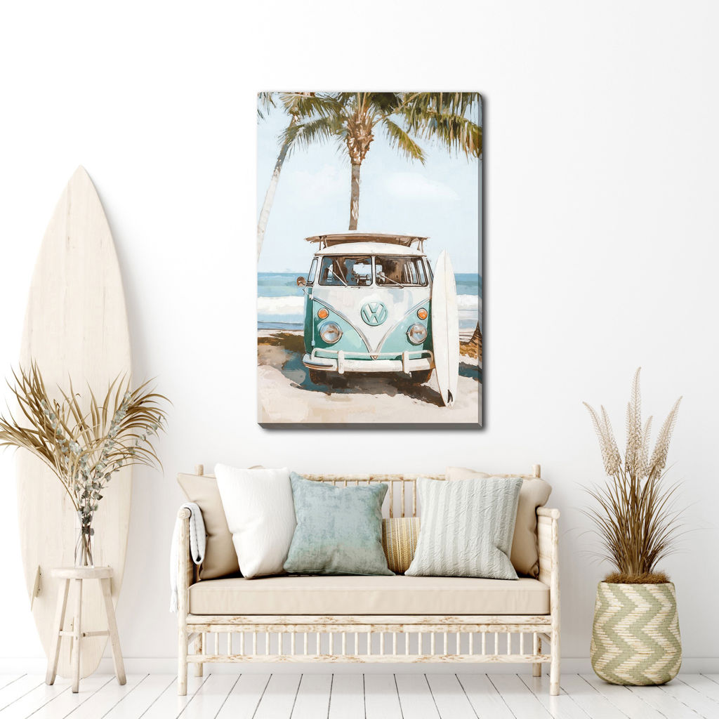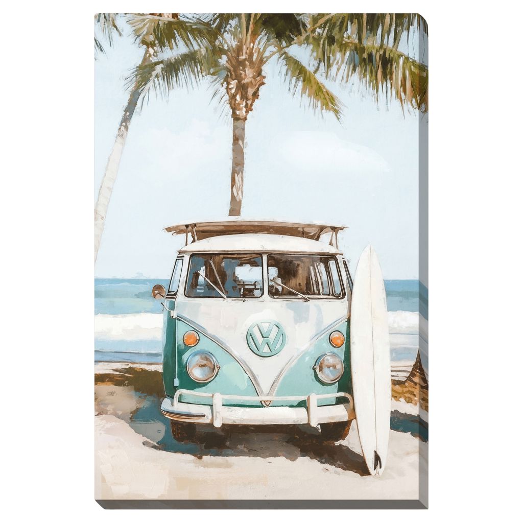 Cette œuvre met en scène un emblématique van rétro stationné sur une plage ensoleillée, entouré de palmiers et prêt pour une journée de surf.