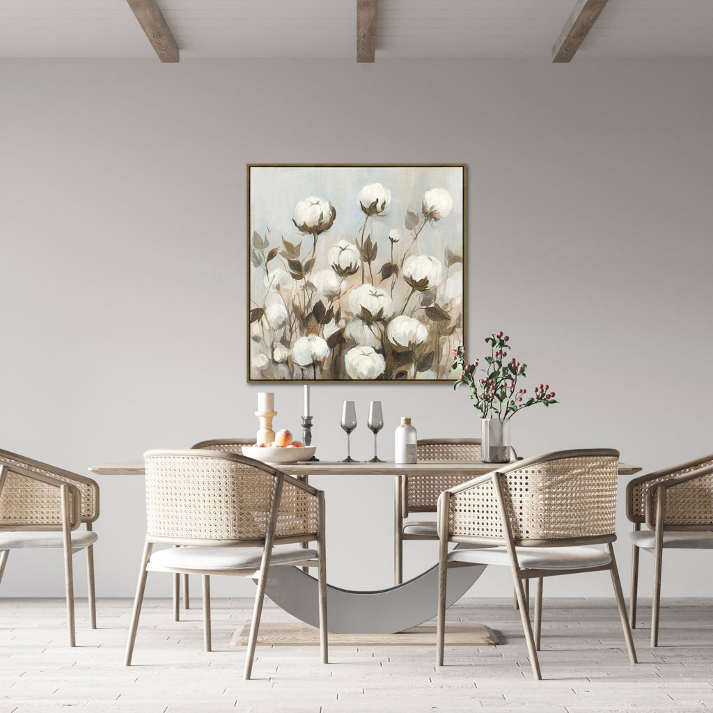 Les textures subtiles et les teintes feutrées évoquent la douceur des champs de coton au soleil. Idéale pour une salle à manger, un salon ou une chambre, cette toile s’harmonise facilement avec les décors rustiques, contemporains ou farmhouse chic.