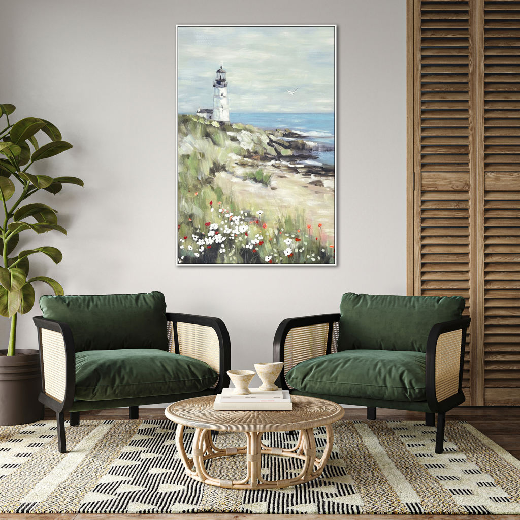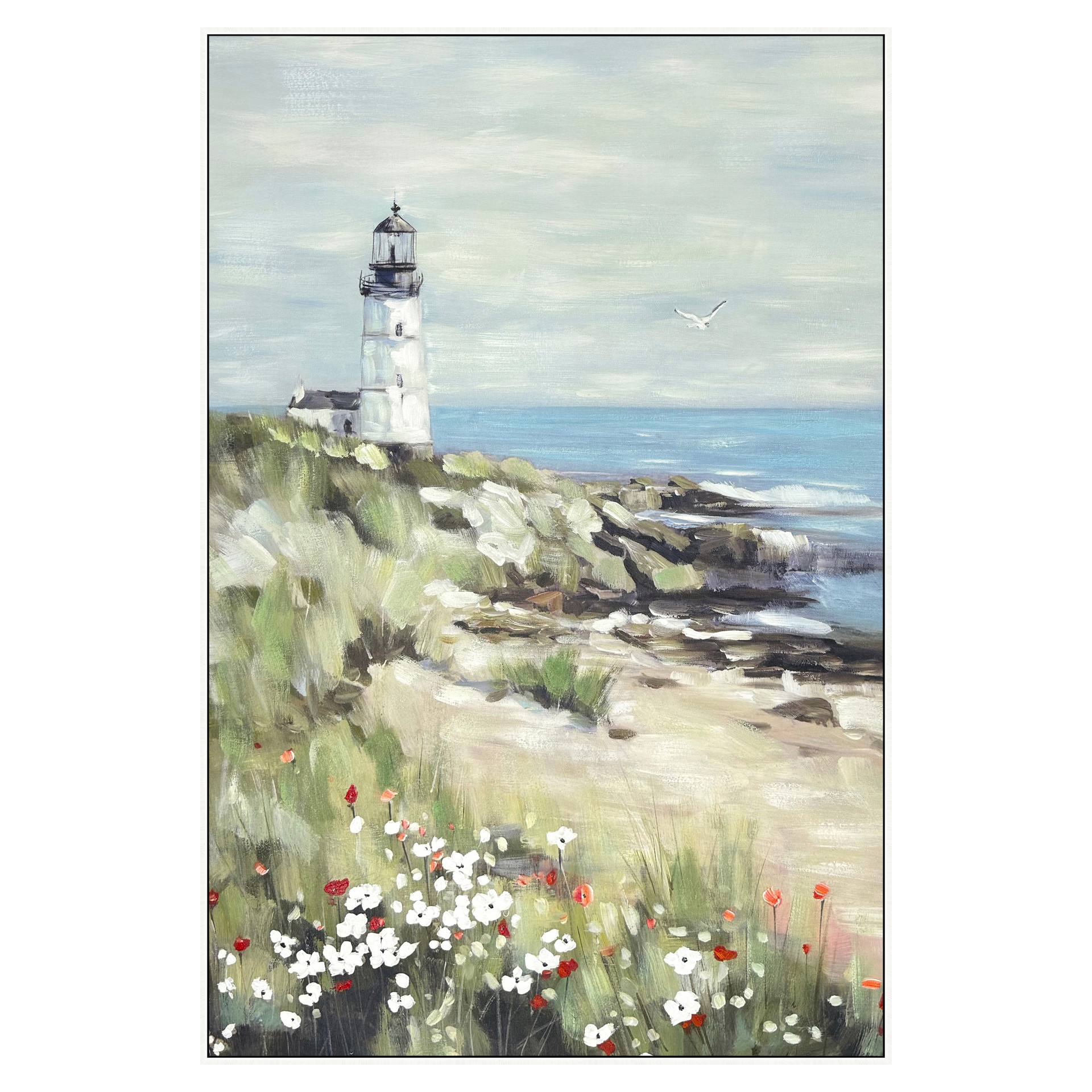 Cette scène côtière représente un phare dressé sur un rivage rocheux, entouré de fleurs sauvages et baigné par la lumière du large.