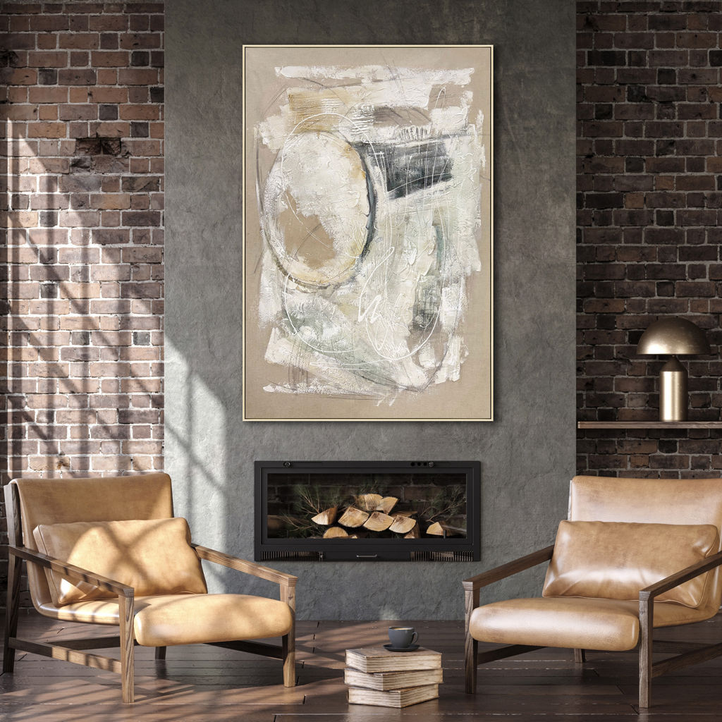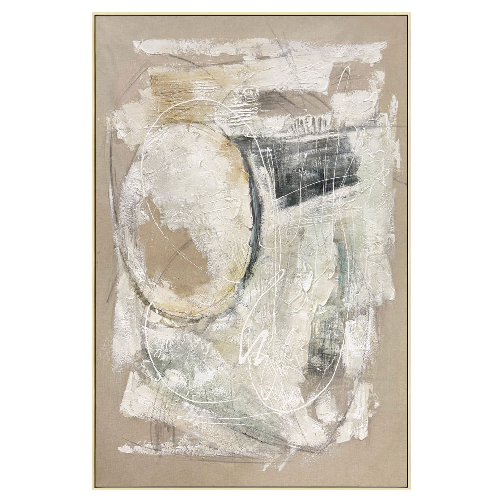 Cette œuvre abstraite marie textures généreuses, coups de pinceau énergétiques et nuances douces de blanc, beige, gris et or pâle.