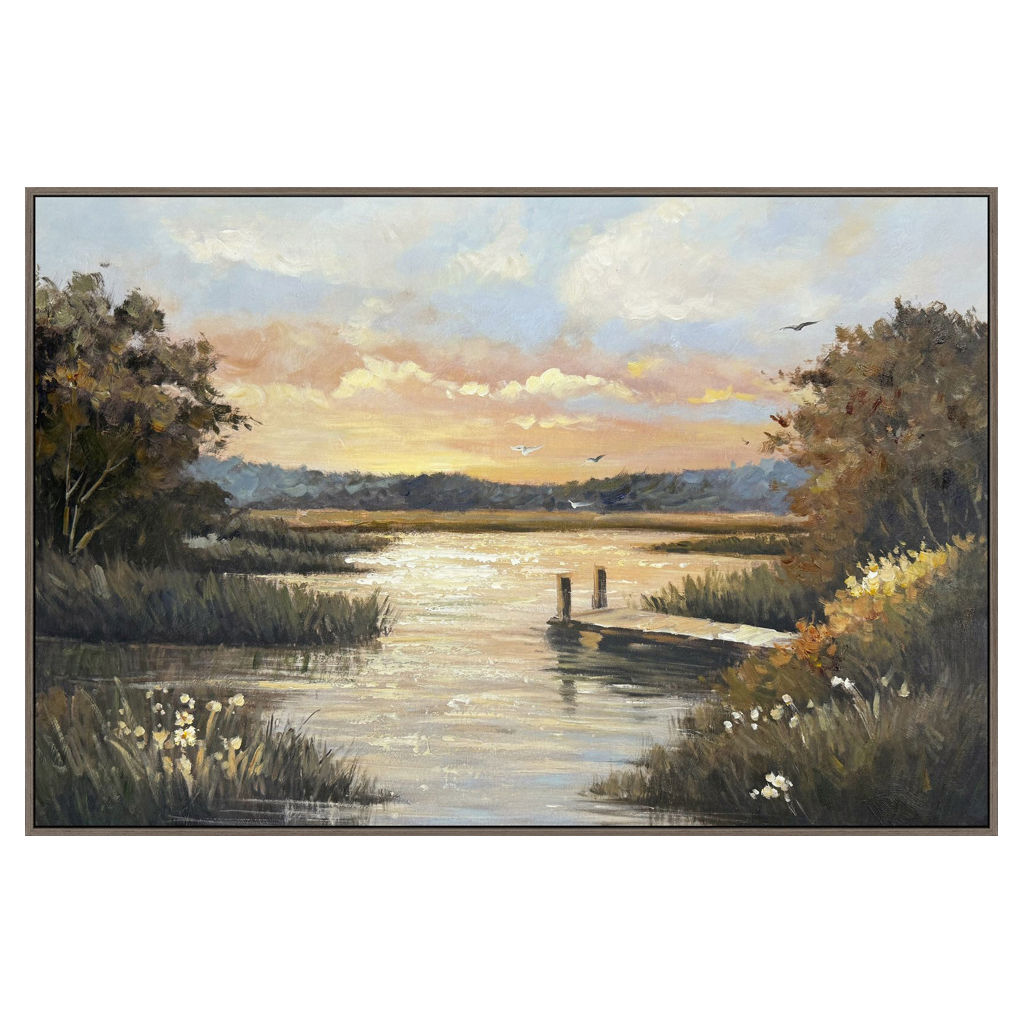 Invitez la douceur d’une fin de journée lumineuse dans votre espace avec Lueur du quai. Cette œuvre apaisante capture un coucher de soleil doré reflétant sur l’eau calme, entouré de verdure et d’un petit quai qui semble inviter à la détente.