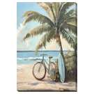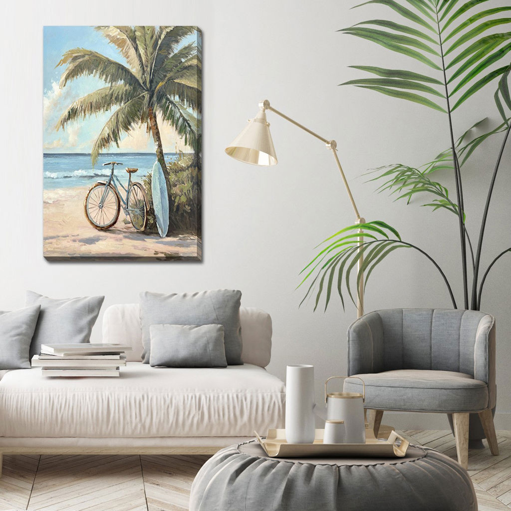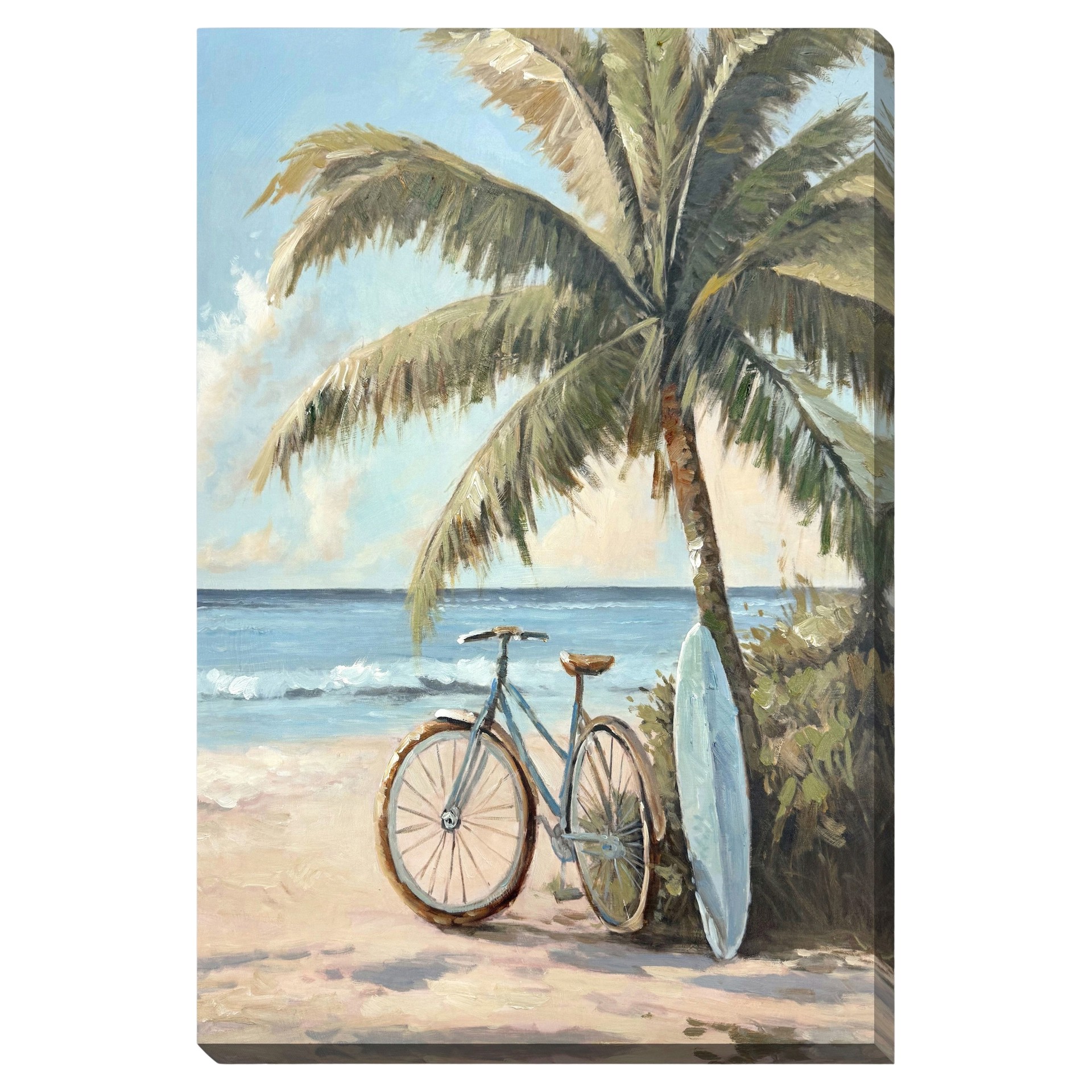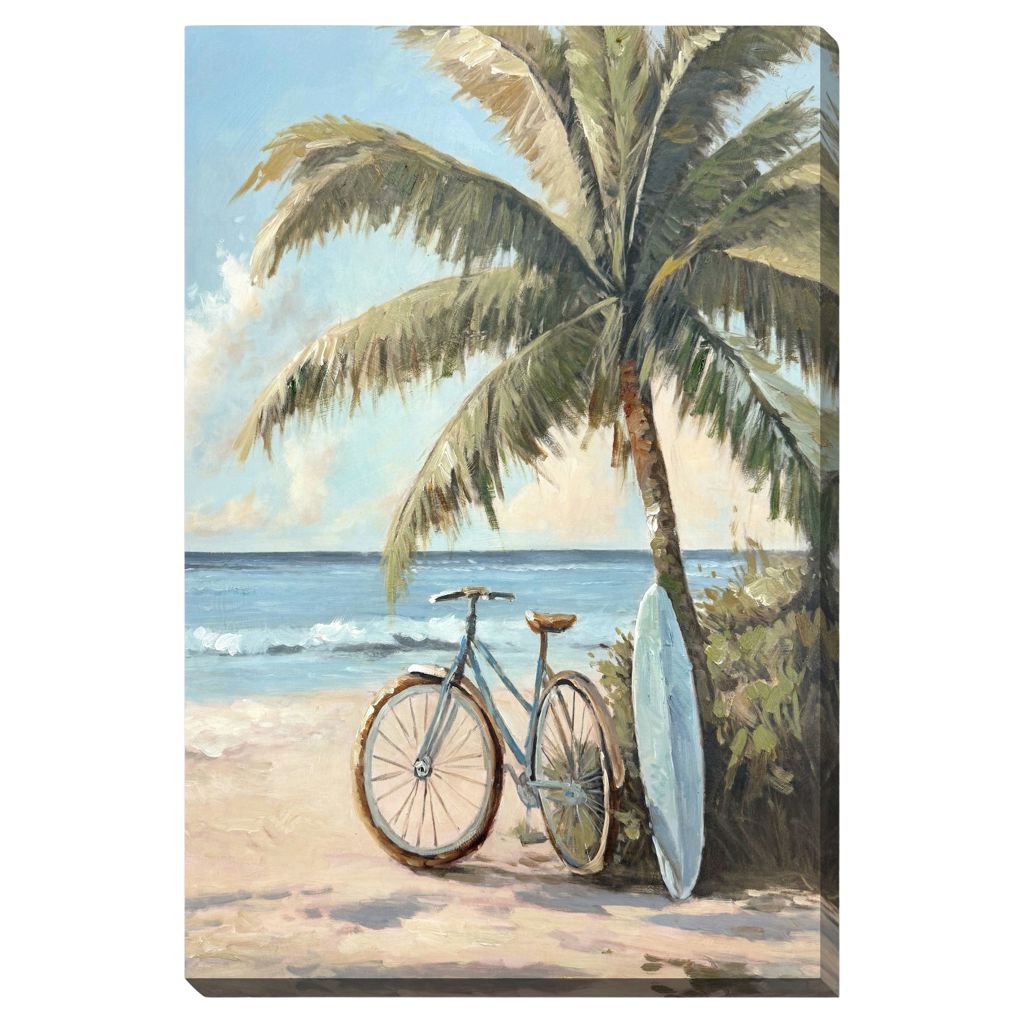 Le vélo appuyé contre un palmier, la planche de surf prête pour la prochaine vague et l’horizon paisible composent une ambiance douce et insouciante.