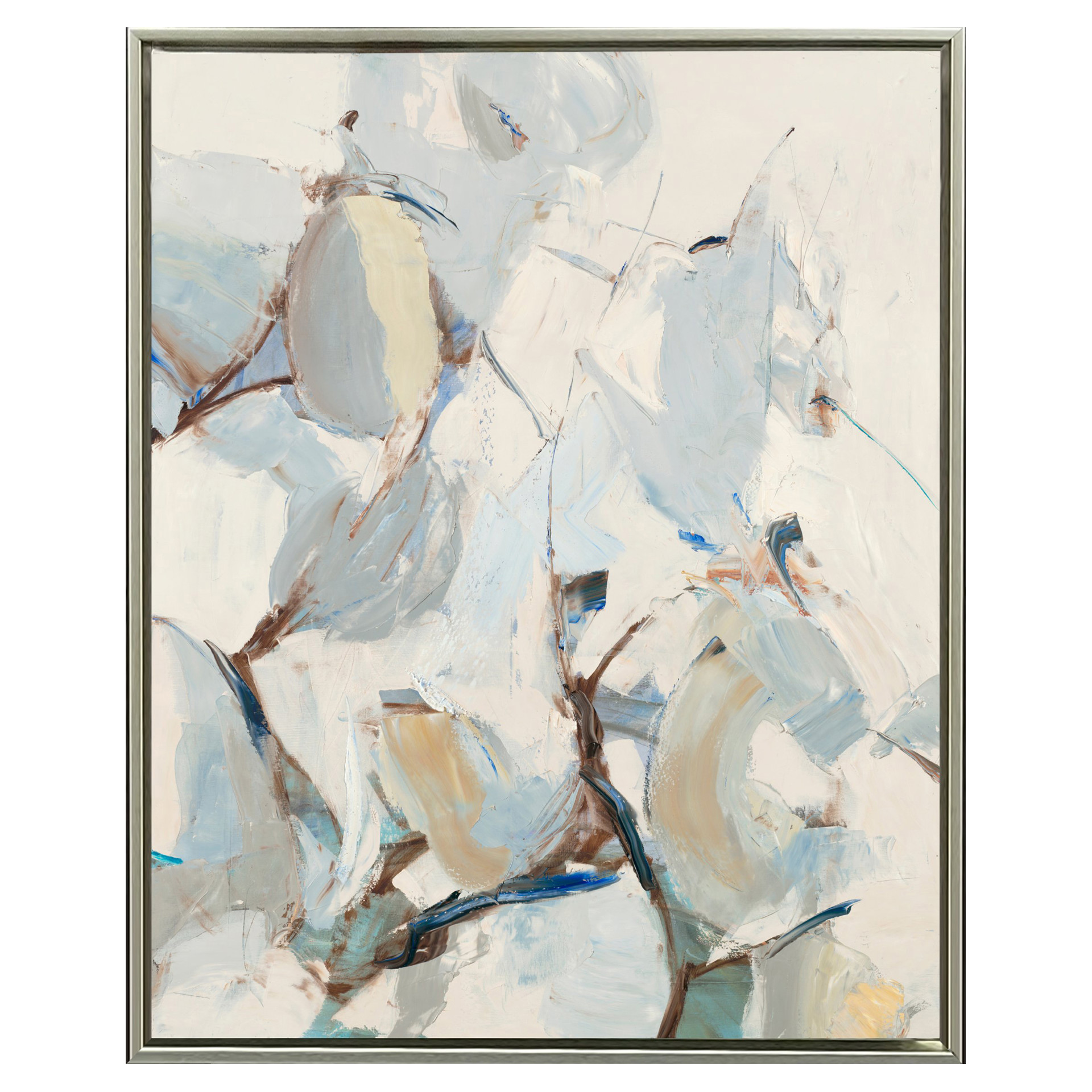 Les poiriers 1 propose une interprétation contemporaine et aérienne de la nature, où les formes se devinent plus qu’elles ne se définissent. Les touches de bleu pâle, de crème et de beige se mêlent à des accents bruns pour évoquer des branches et des fruits dans un mouvement presque dansant.