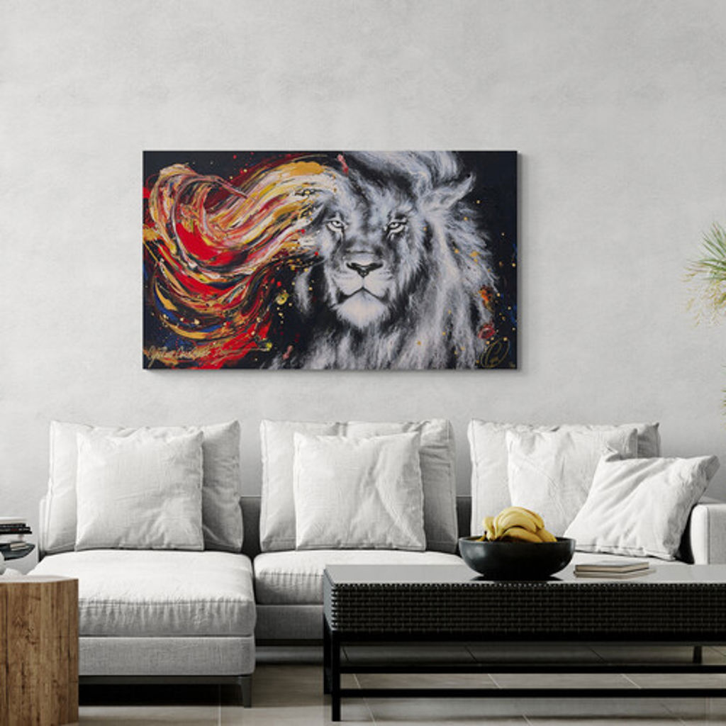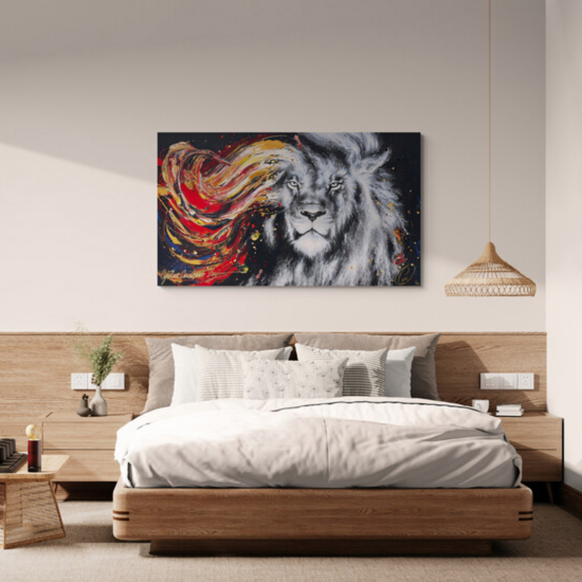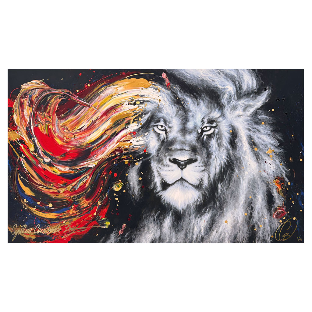 Dans cette œuvre percutante, Cynthia Coulombe Bégin incarne la force intérieure à travers le regard intense d’un lion, symbole de puissance et de souveraineté. Sa crinière, en fusion avec des éclats de couleurs vives et gestuelles, évoque un feu sacré en mouvement — celui de notre énergie créatrice.