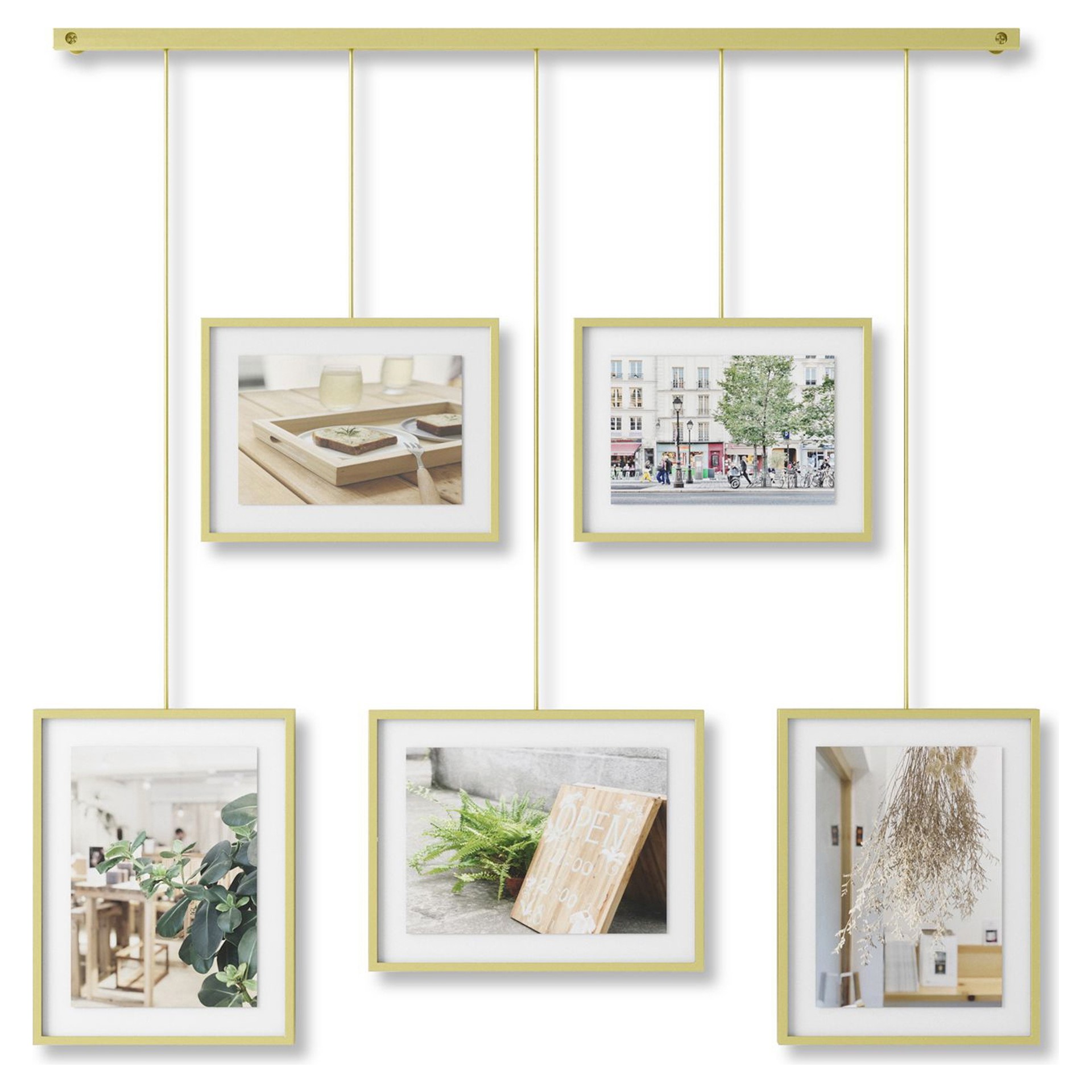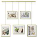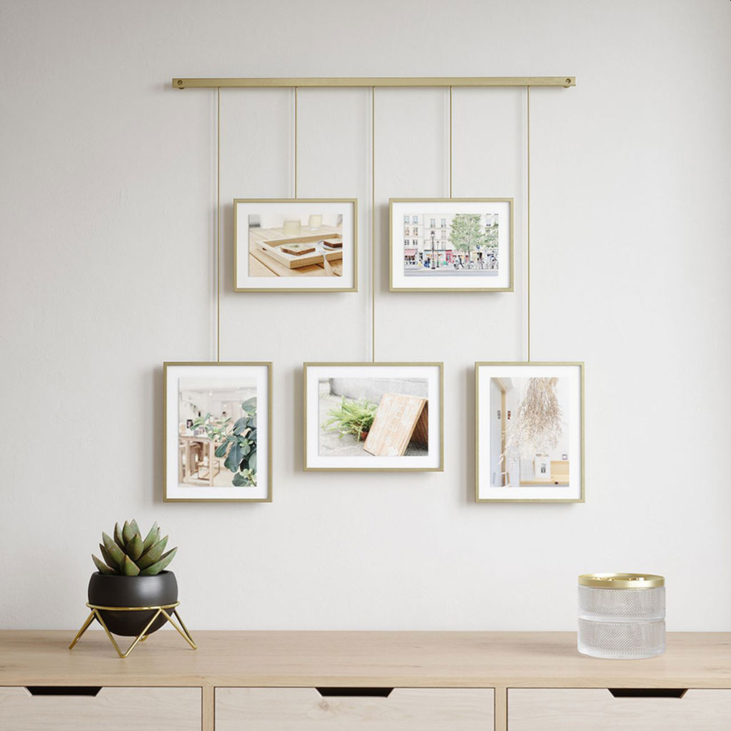 Le présentoir de photos d'exposition comprend un rebord mural en métal brossé avec des pinces et des supports pour contenir cinq cadres photo de style galerie de différentes tailles, tout en réduisant la quantité de dommages généralement laissés sur les murs.