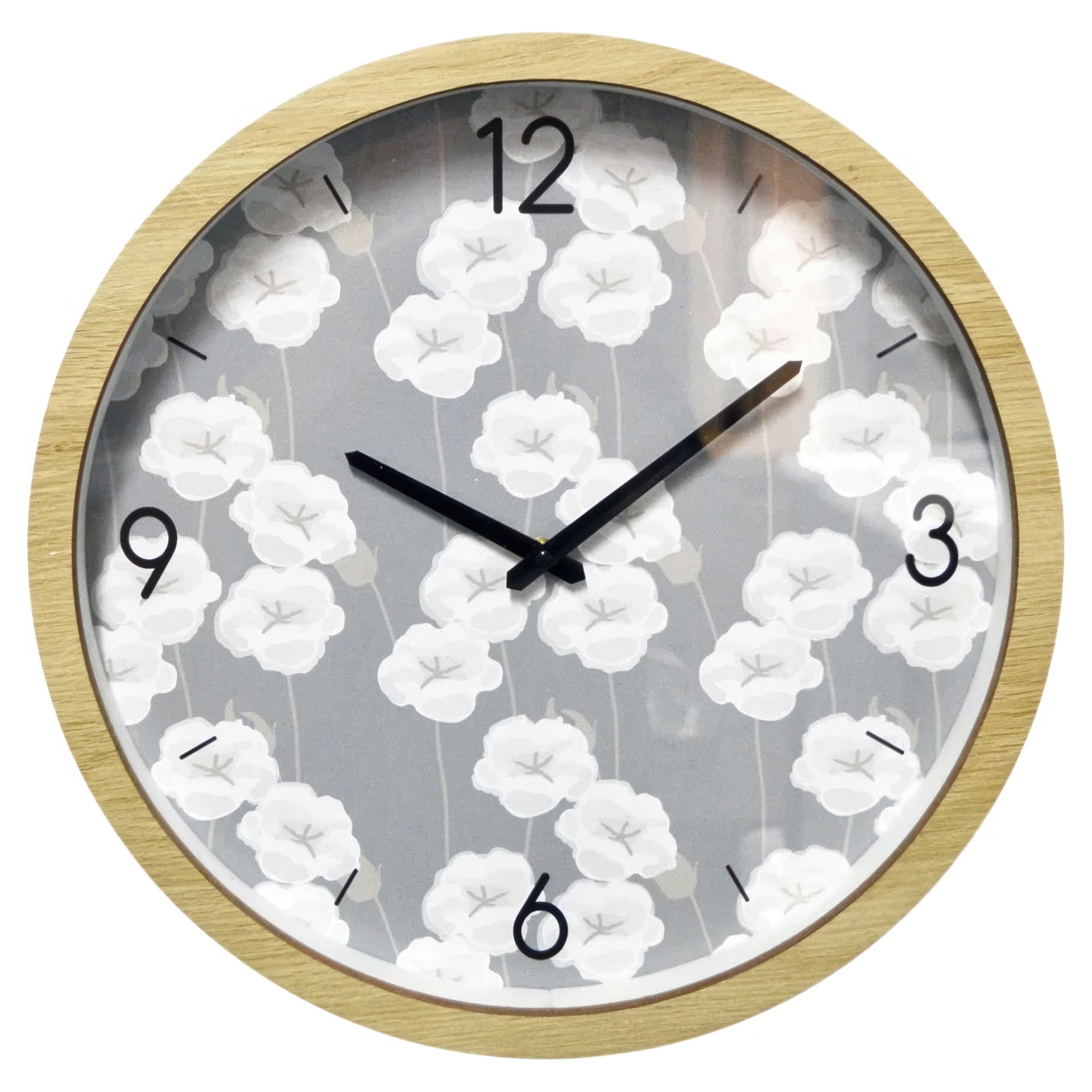 Cette horloge murale ronde présente un cadre en bois naturel et un fond décoratif orné d´un motif floral blanc sur fond gris. Son design élégant et épuré s´intègre parfaitement dans une décoration moderne ou scandinave.