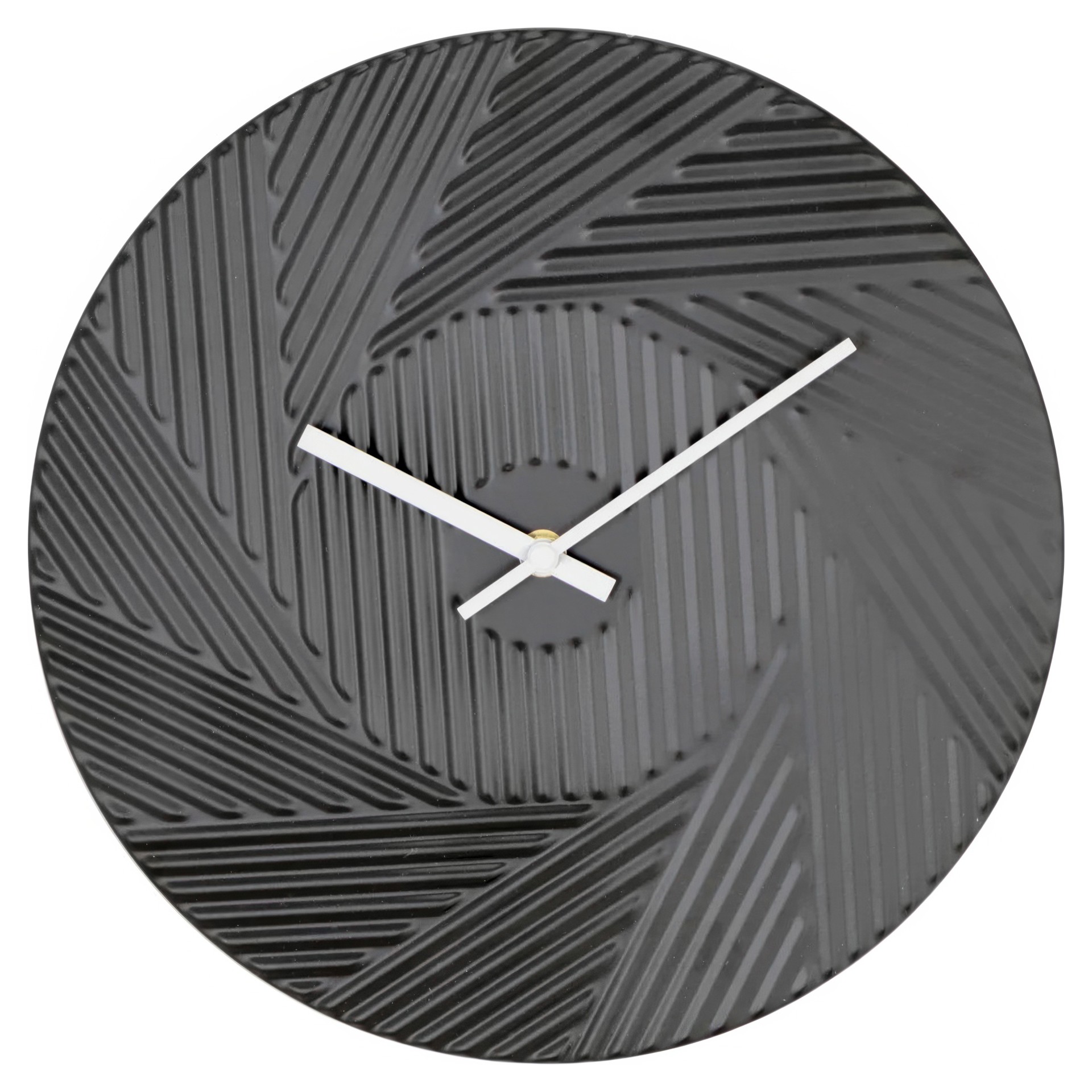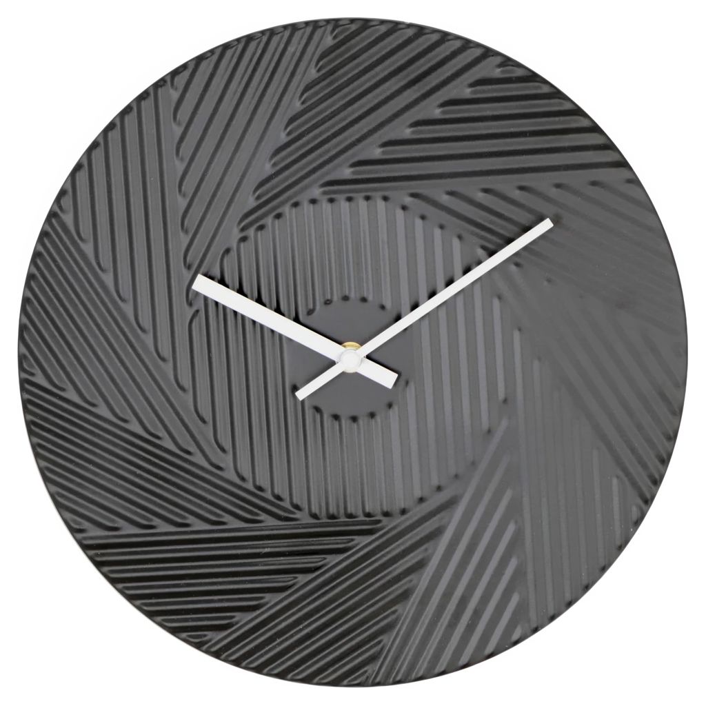 Cette horloge murale noire arbore un design moderne avec un motif texturé en relief, apportant une touche élégante et contemporaine à tout espace. Ses aiguilles blanches contrastent joliment avec le fond sombre, assurant une lisibilité optimale.
