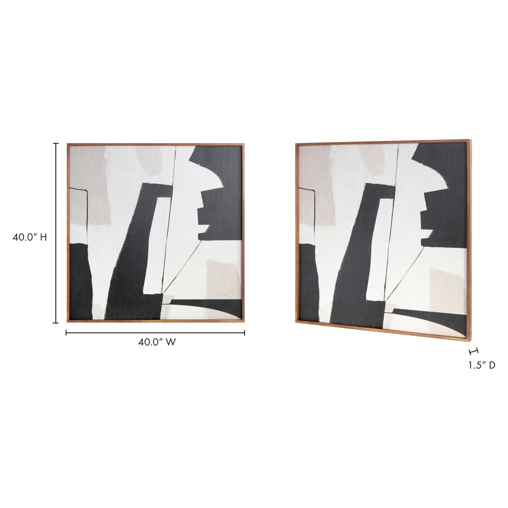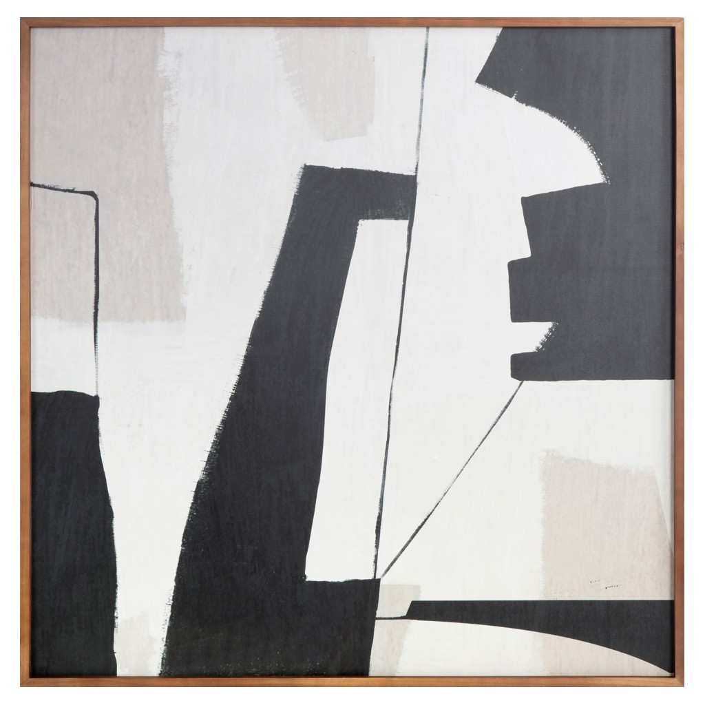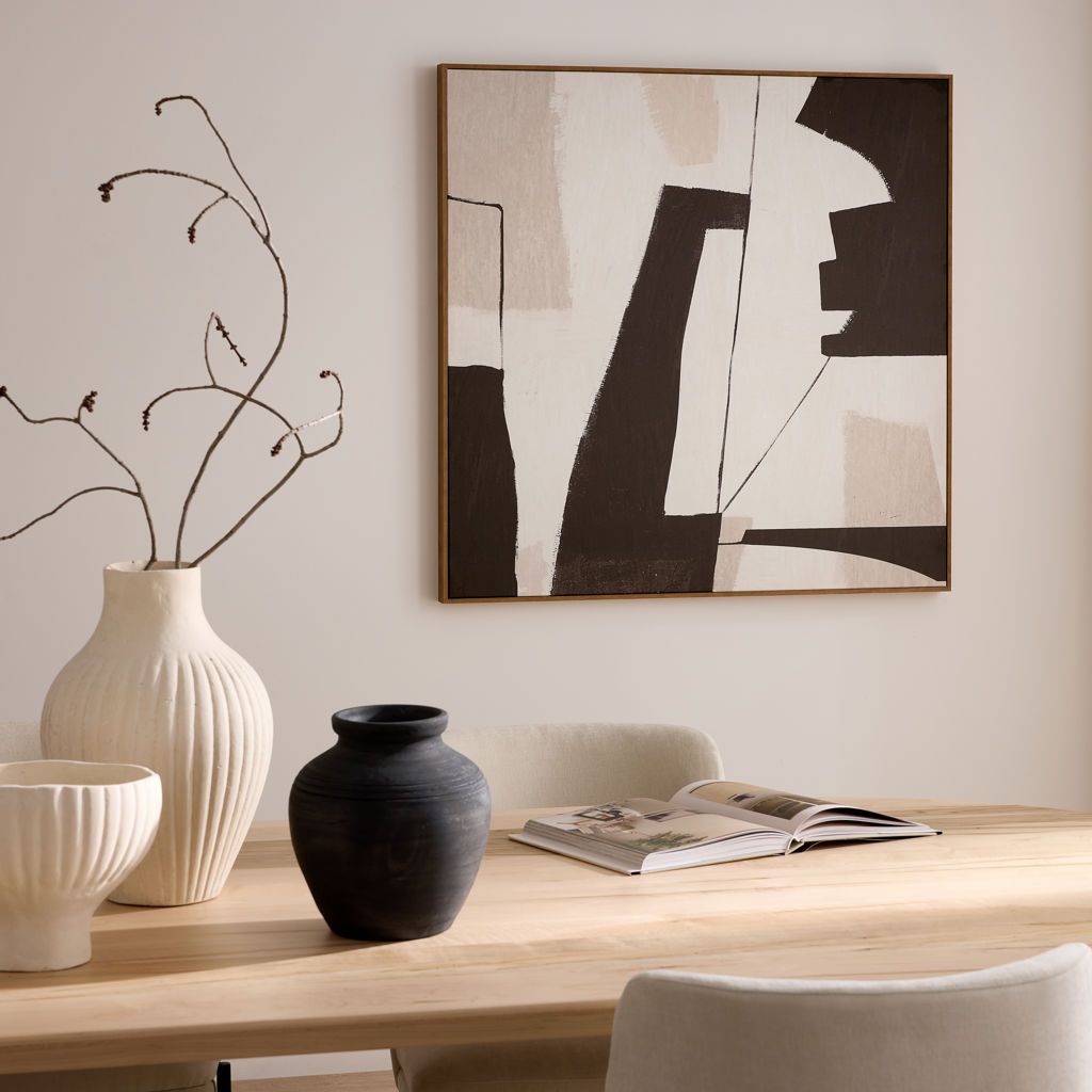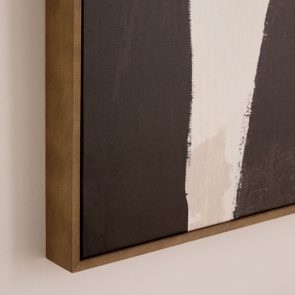 Nostalgia est une pièce au charme familier. Les formes abstraites et les lignes graphiques sont mises en valeur par des beiges doux et chauds. Le cadre en pin massif est fini dans un brun moyen faisant écho à un décor moderne du milieu du siècle.