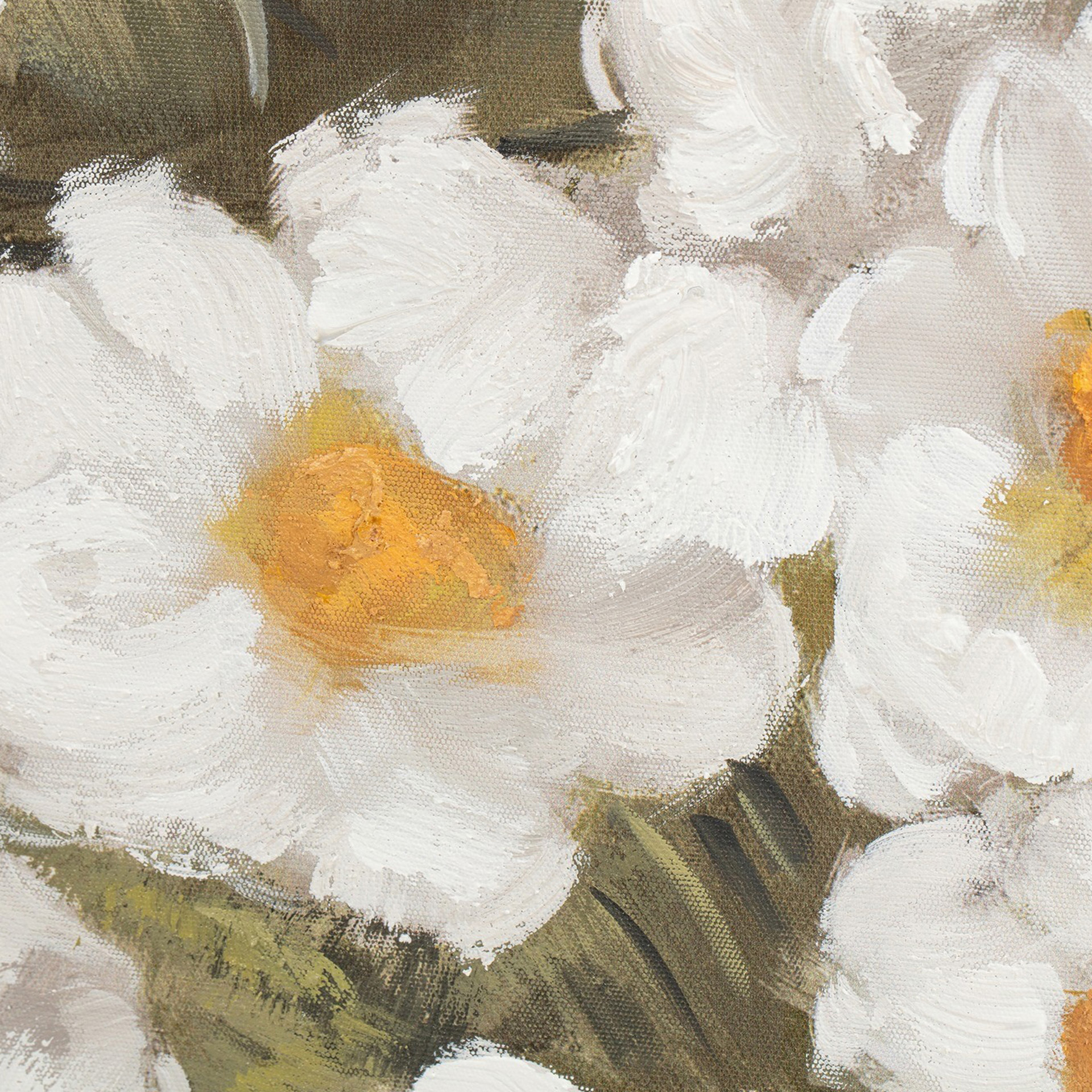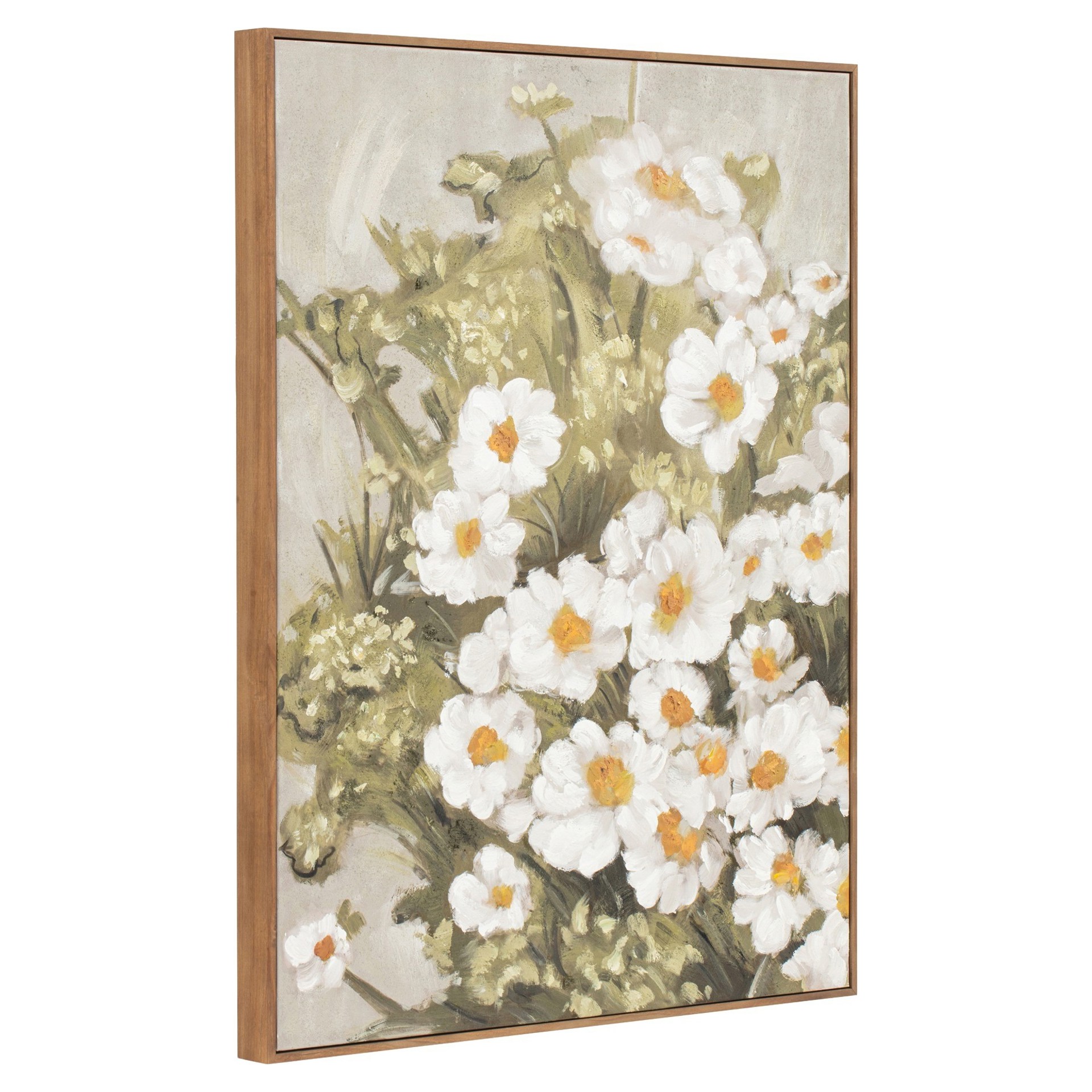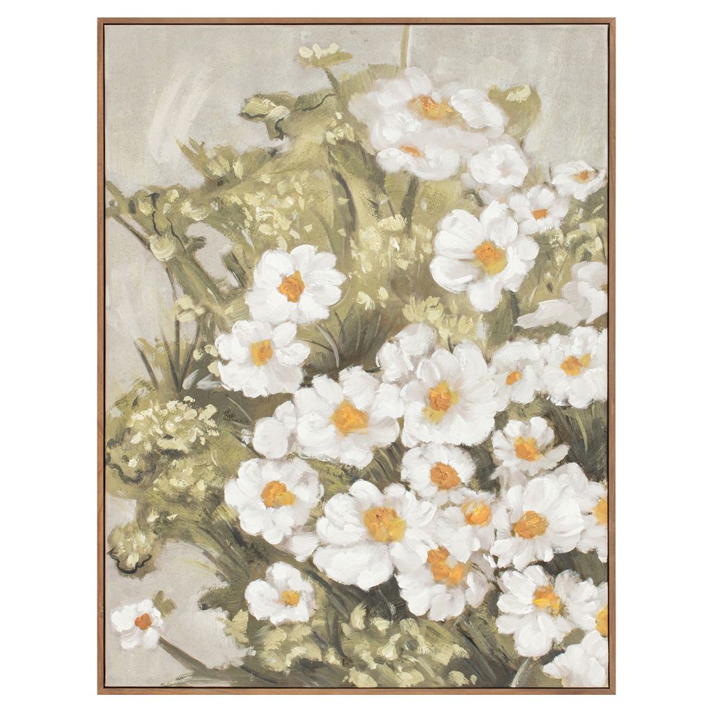 Cette œuvre enchantée révèle une flore délicate qui s'épanouit en touches douces et oniriques sur la toile. Les marguerites et la verdure des prés s'harmonisent parfaitement avec une toile de fond discrète, créant une composition d'une beauté saisissante.