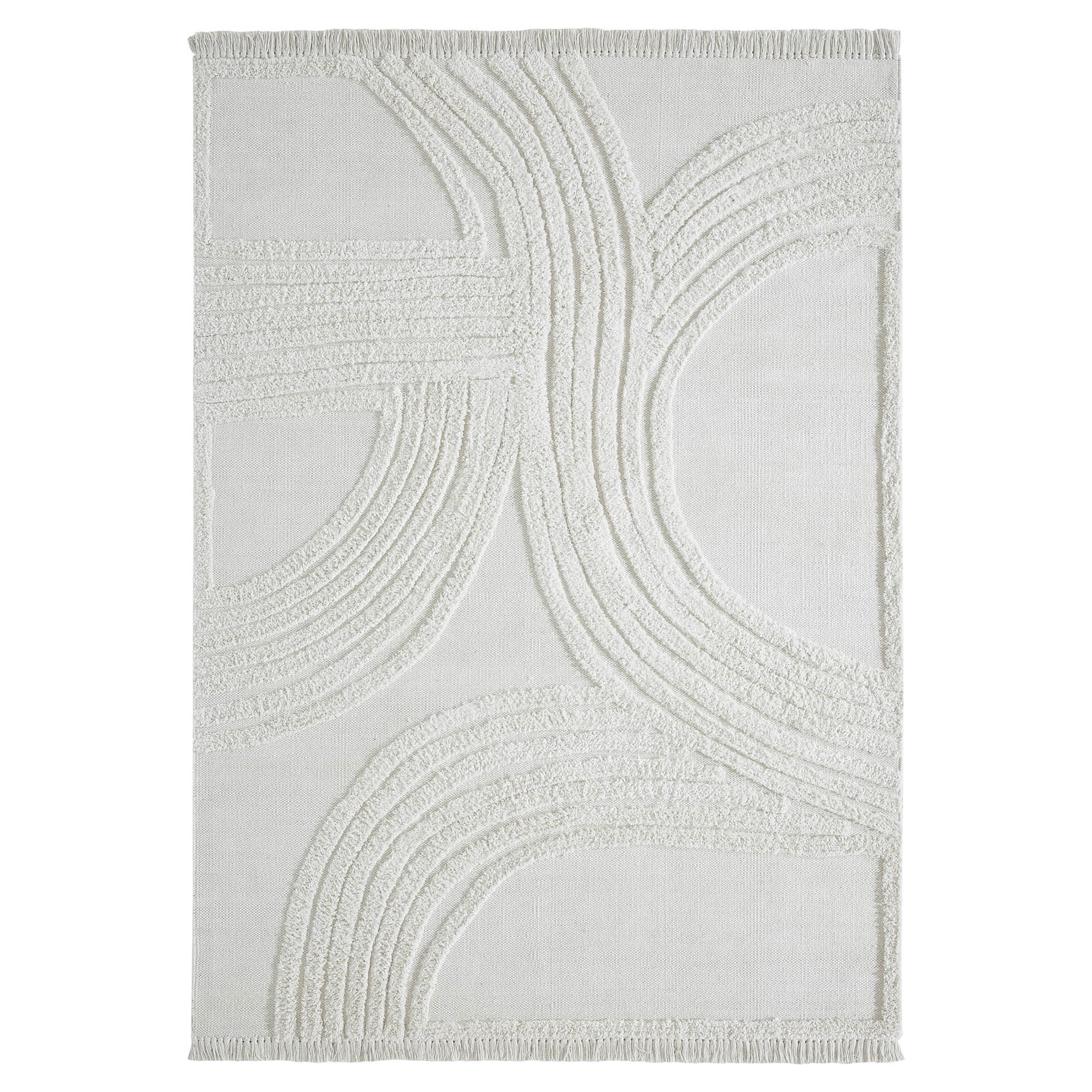 Une qualité insouciante enveloppe l´intérieur à travers ce tapis. Les détails arqués en forme d´arc-en-ciel et les franges de ce tapis en coton confèrent une qualité accueillante à n´importe quelle pièce dans laquelle il se trouve.