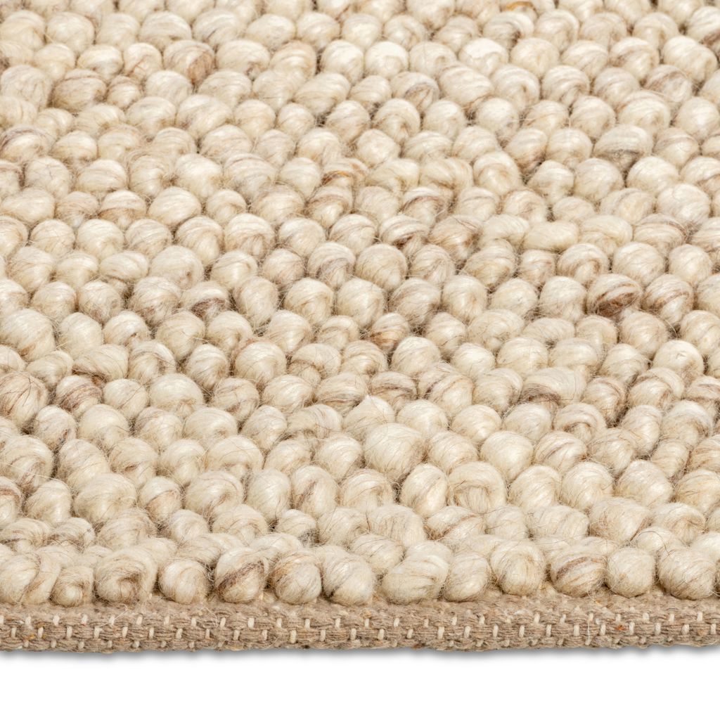Ce tapis présente une texture luxueuse avec une surface moderne effet galet, confectionné en laine douce, lui conférant une allure haut de gamme.