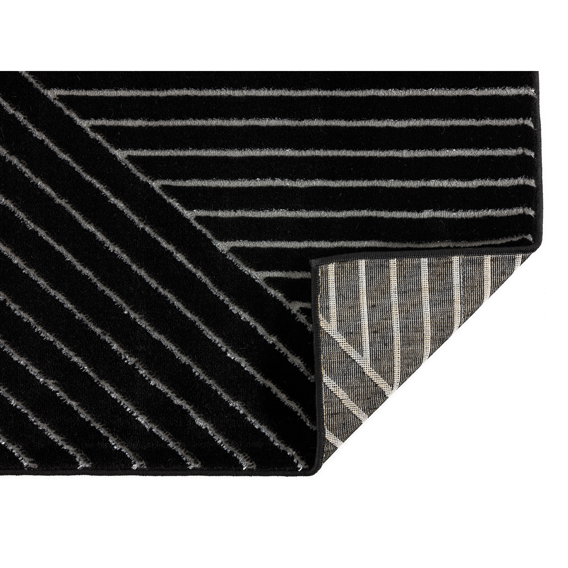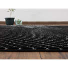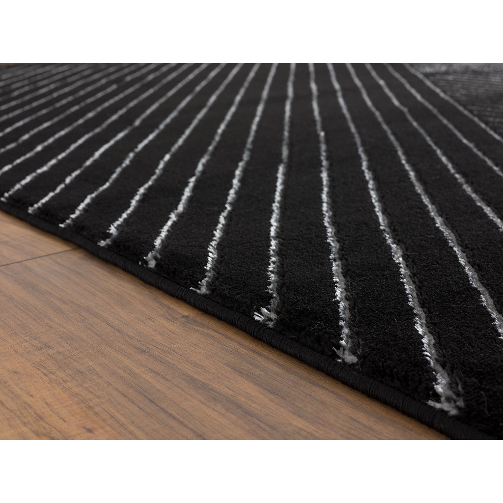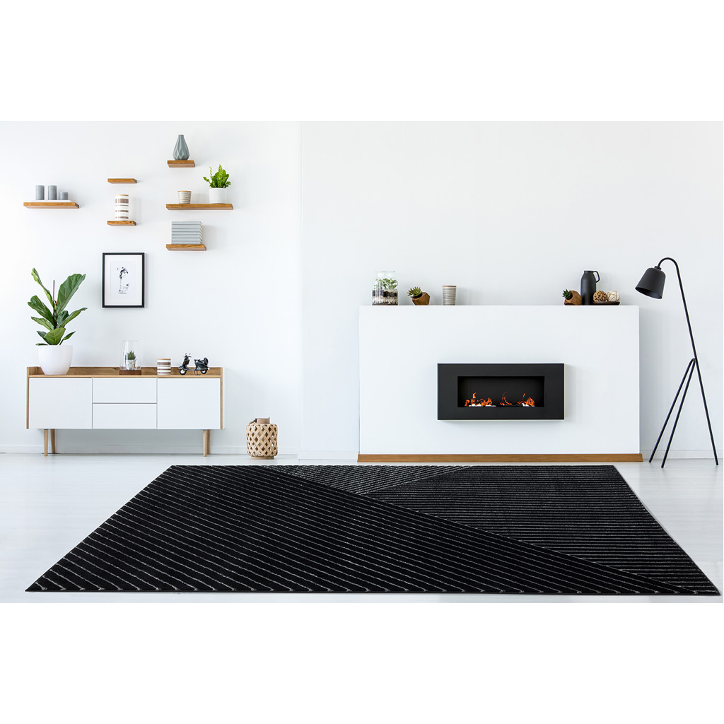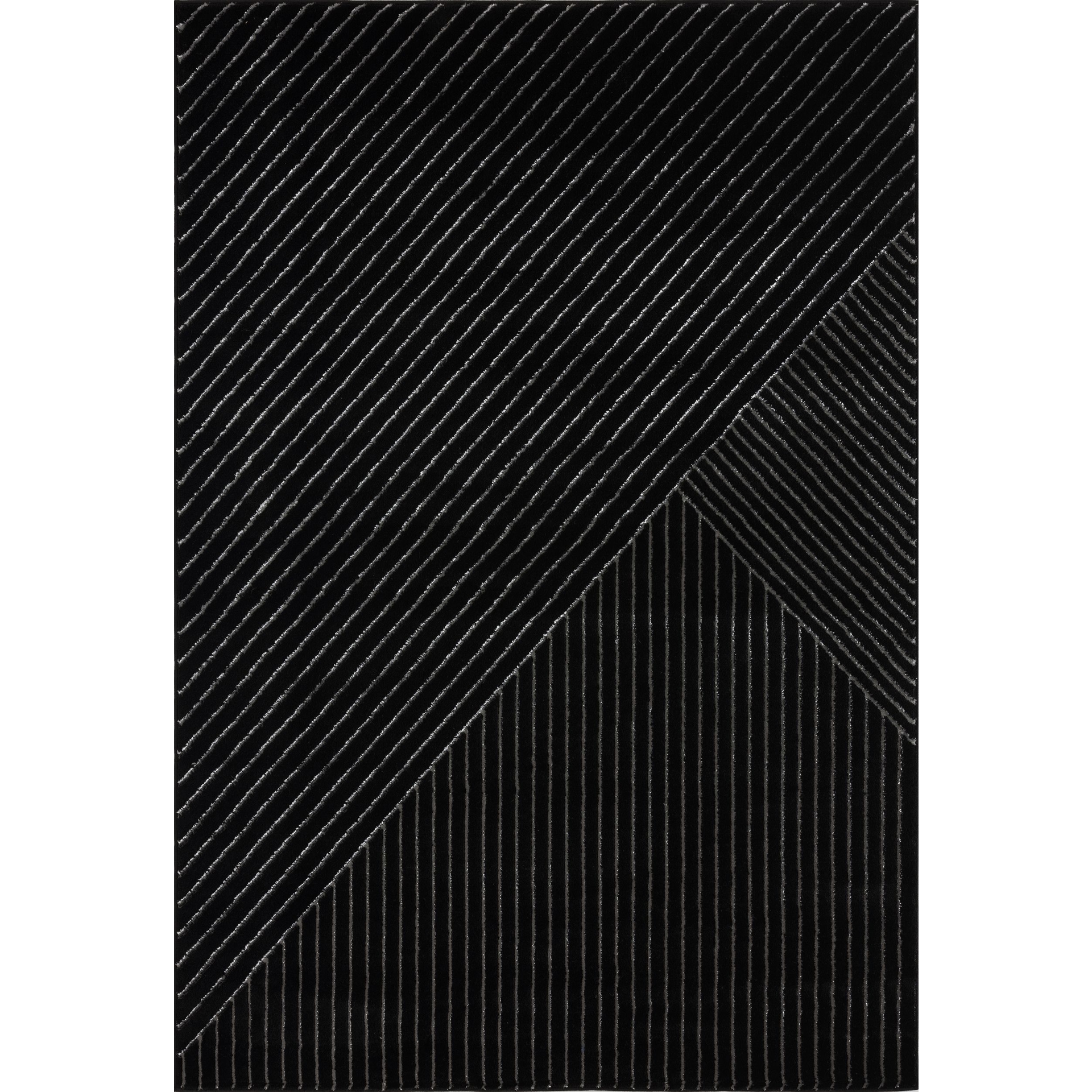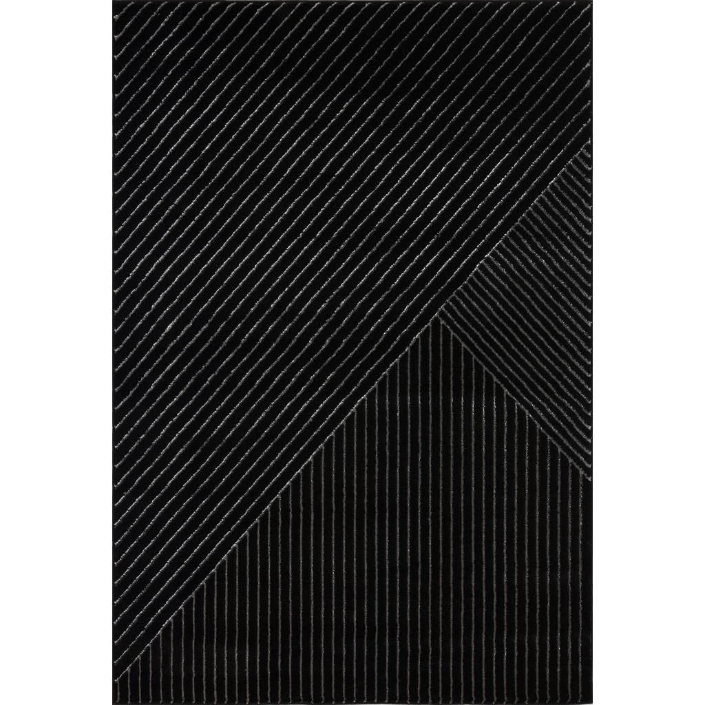 Établissez une base moderne pour votre espace élégant à l’intérieur avec ce tapis, mettant en valeur un motif géométrique noir et argenté.