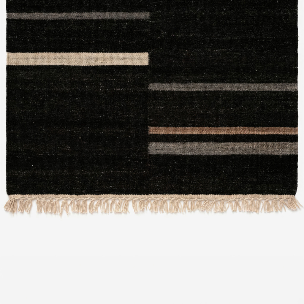 Composé à 80 % de laine et 20 % de coton, ce tapis léger est tissé à la main sur un métier à tisser de plancher.