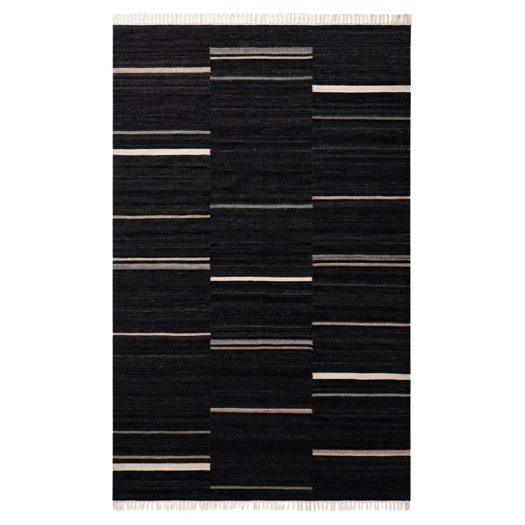 Composé à 80 % de laine et 20 % de coton, ce tapis léger est tissé à la main sur un métier à tisser de plancher.