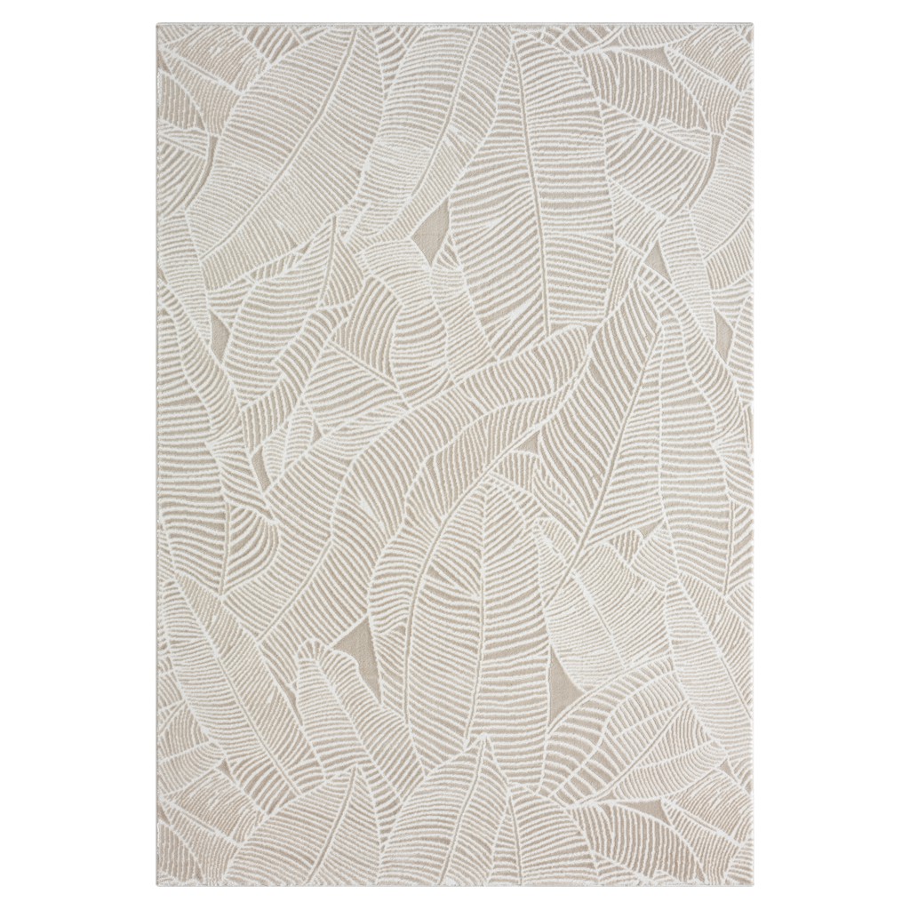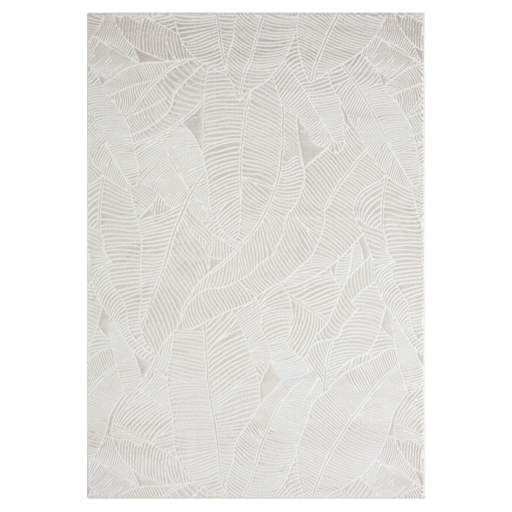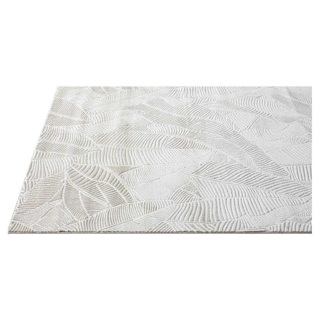 Carpette décorative moderne, douce au toucher et texture réconfortante. Motif feuillage ton sur ton. Faite en polypropylène et polyester.