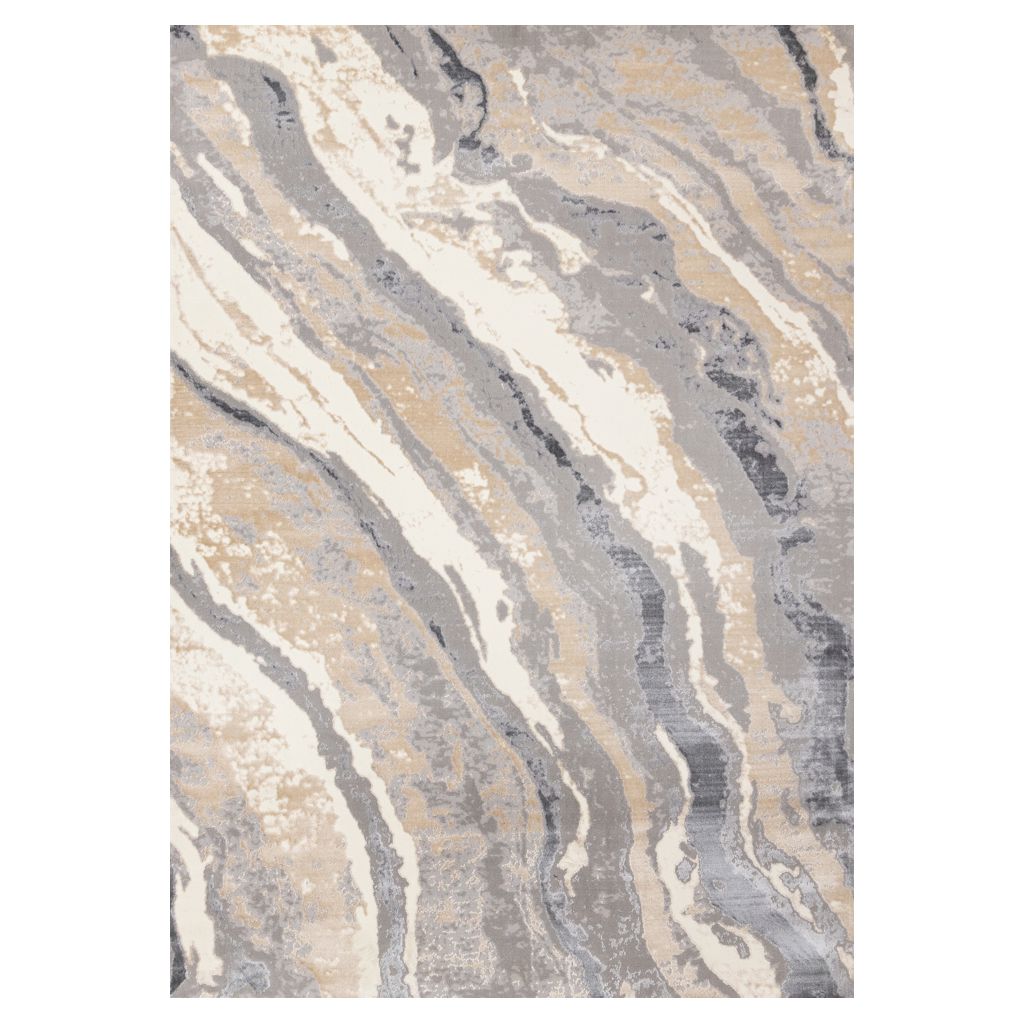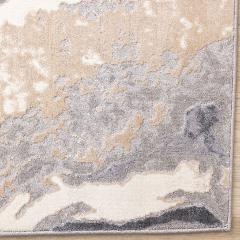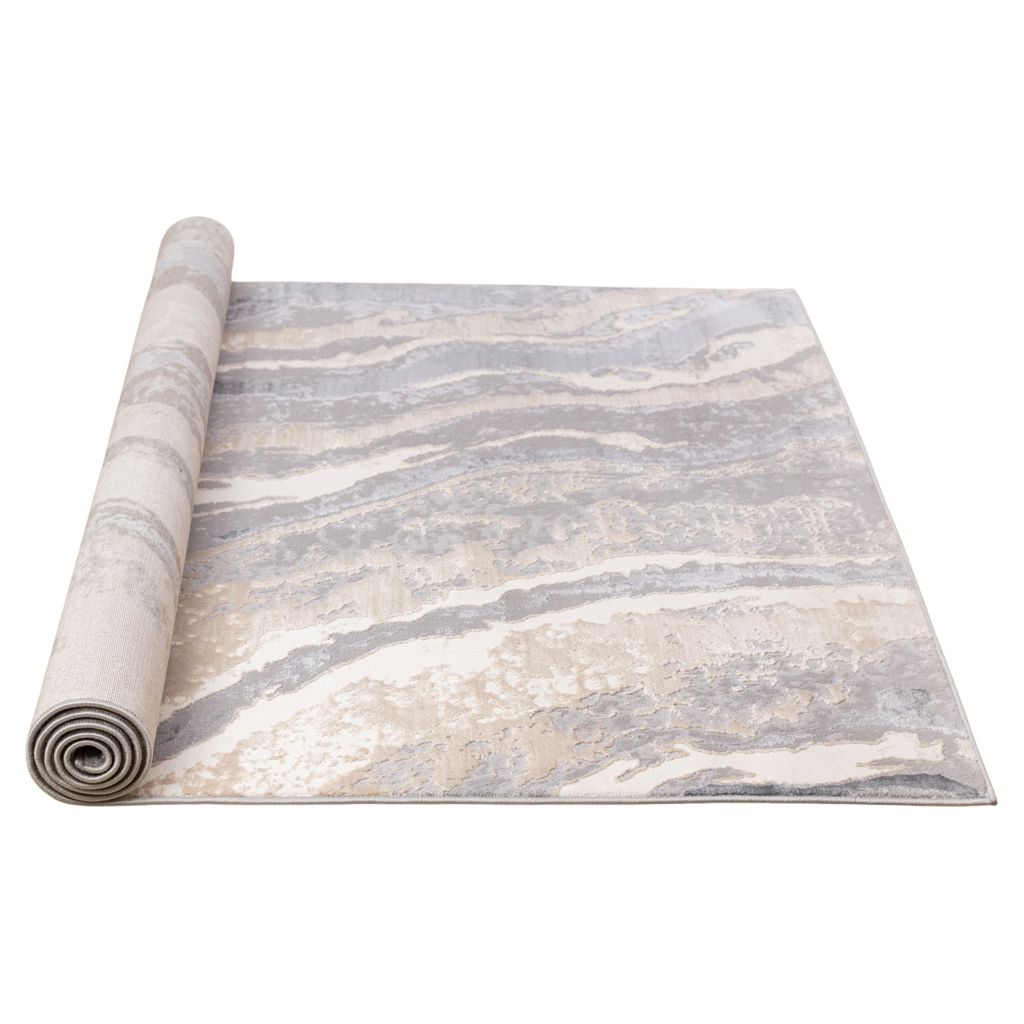 Ses magnifiques motifs contemporains se déclinent dans une palette agréable de gris froids, de beige, de taupe et de blanc.