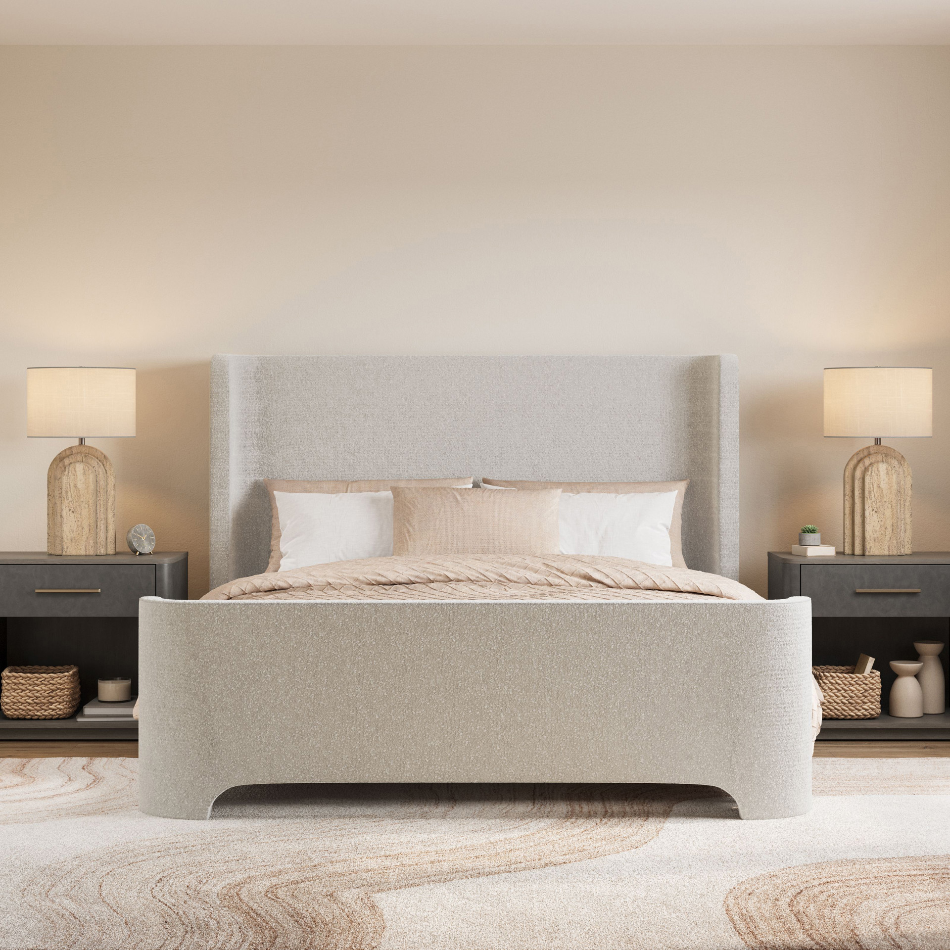 Le magnifique design du tapis Sanibel présente des courbes fluides qui imitent les couches complexes et les variations de tons de la nature. Les fils de laine touffetés à la main créent une texture riche et confortable.