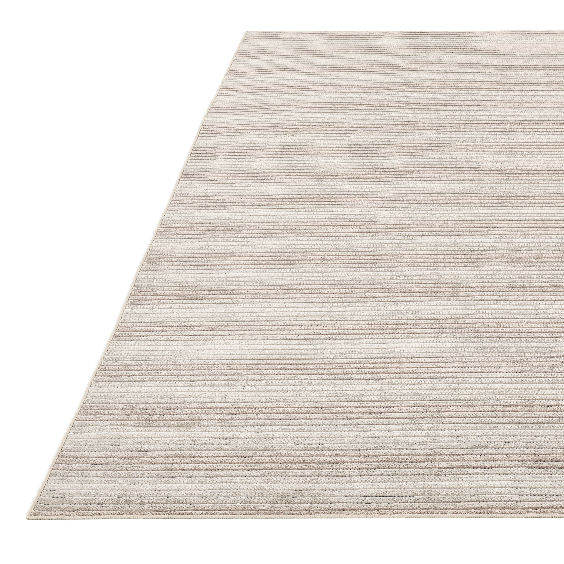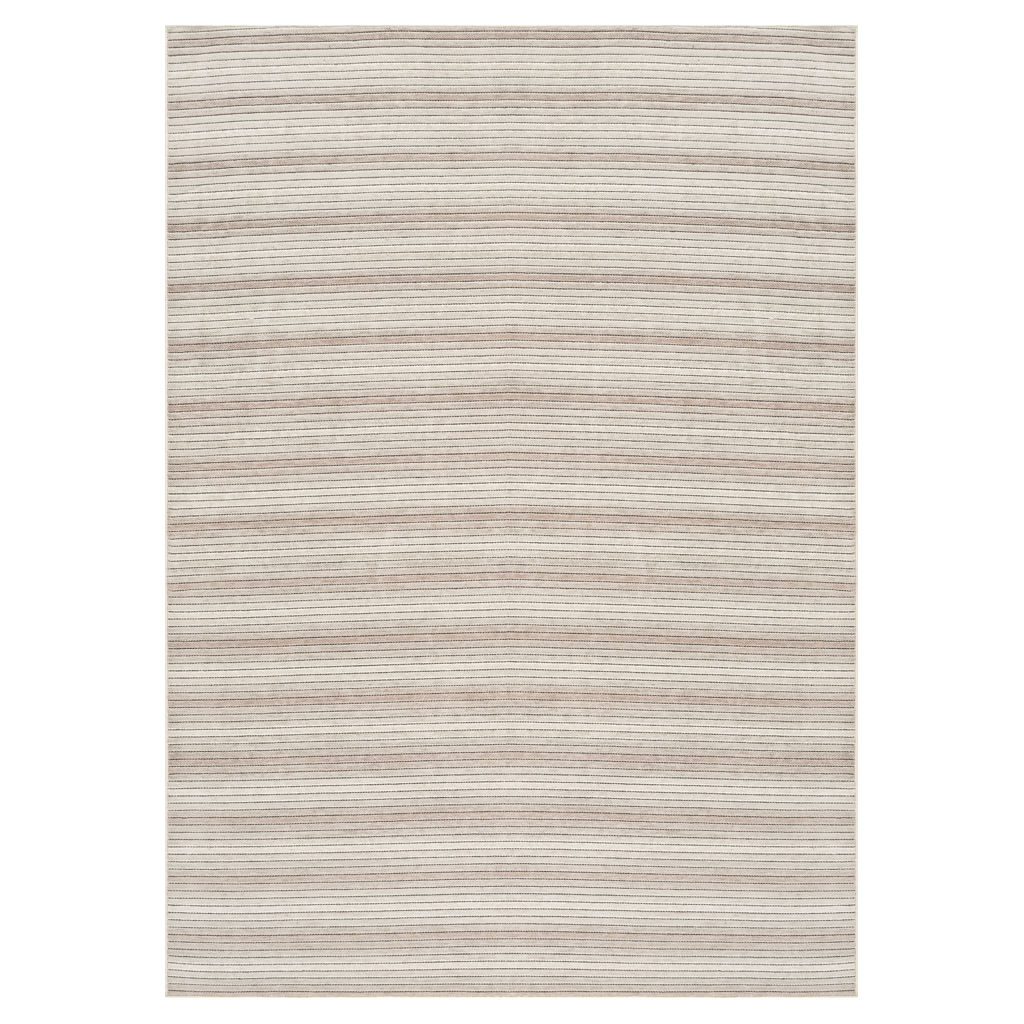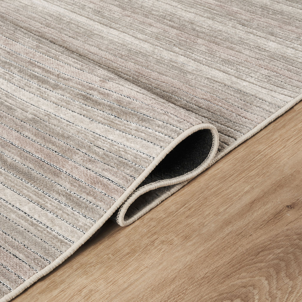 Ce tapis moderne présente un motif de lignes horizontales subtilement texturées dans des tons de taupe et de gris, parfait pour ajouter de la profondeur et de l'élégance à votre espace.