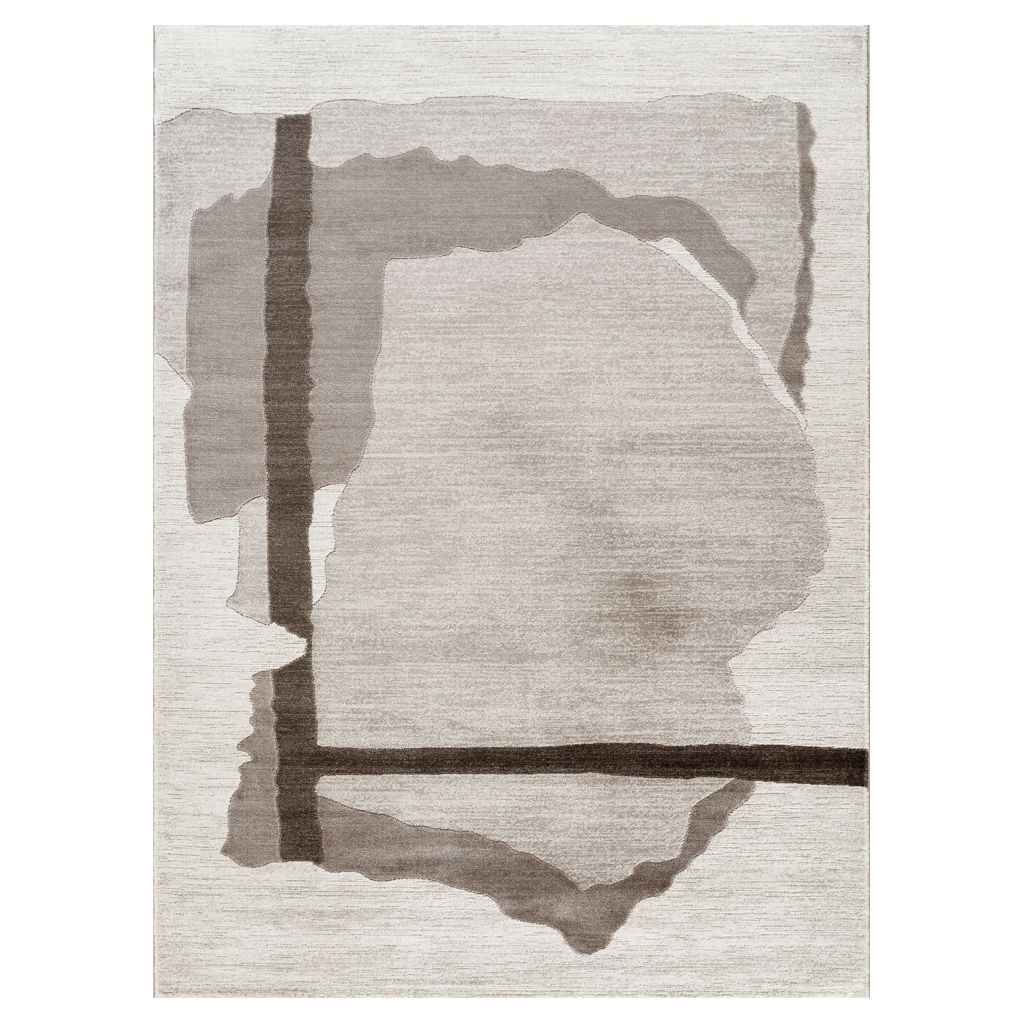 Ce tapis d'art abstrait se distingue par ses formes organiques et ses lignes graphiques dans des tons doux de beige et de brun, offrant une pièce maîtresse moderne et sophistiquée.