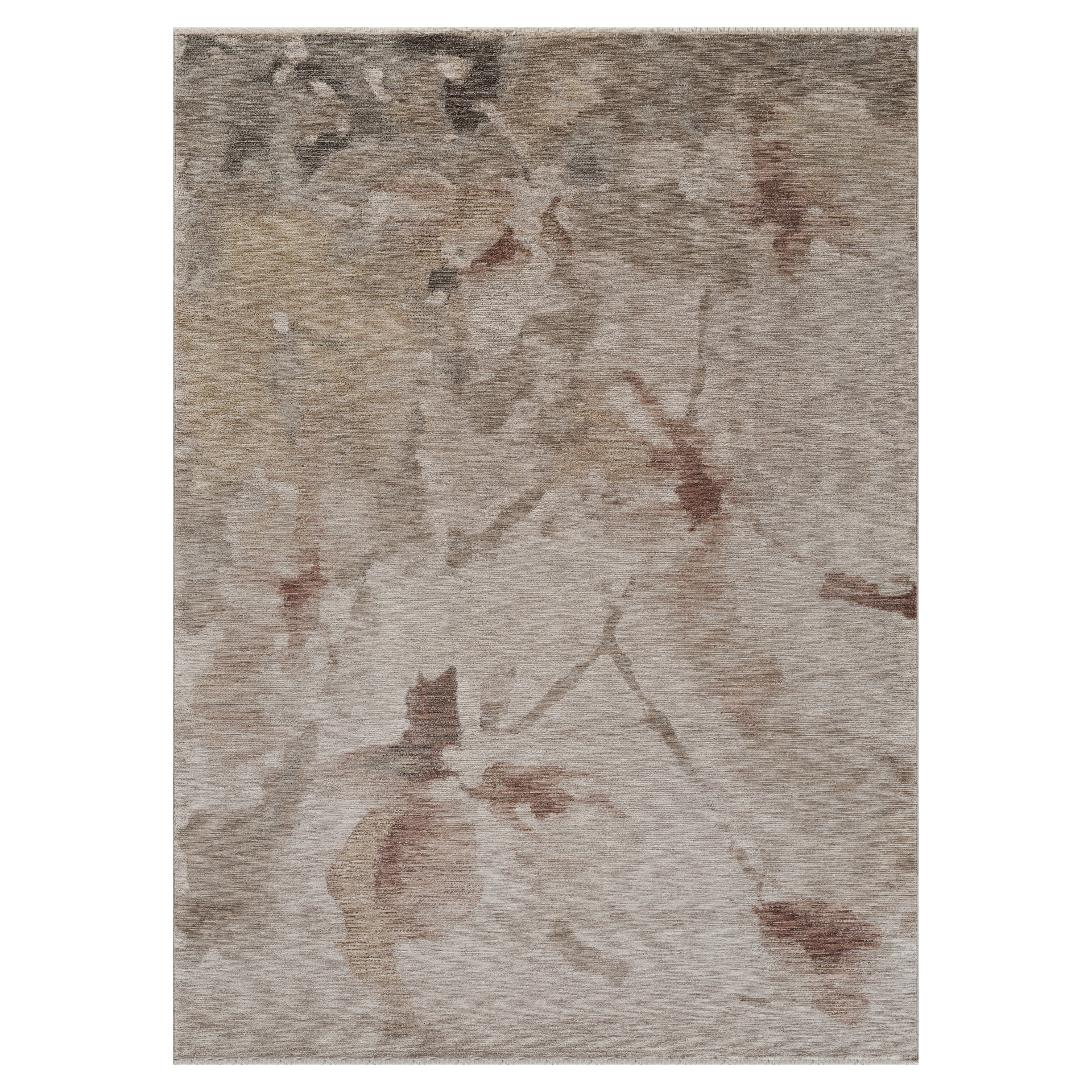 Ce tapis clair présente un motif abstrait inspiré de la nature dans des tons doux de beige, marron et taupe, parfait pour créer une atmosphère apaisante et texturée dans votre espace.
