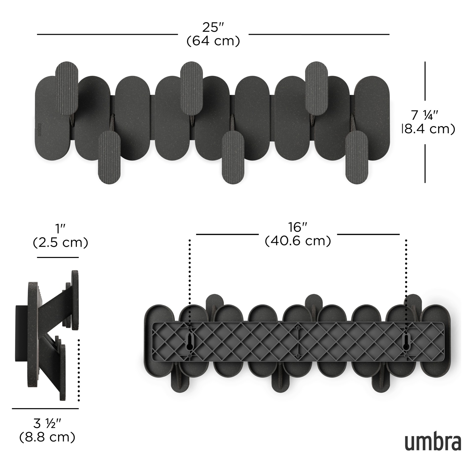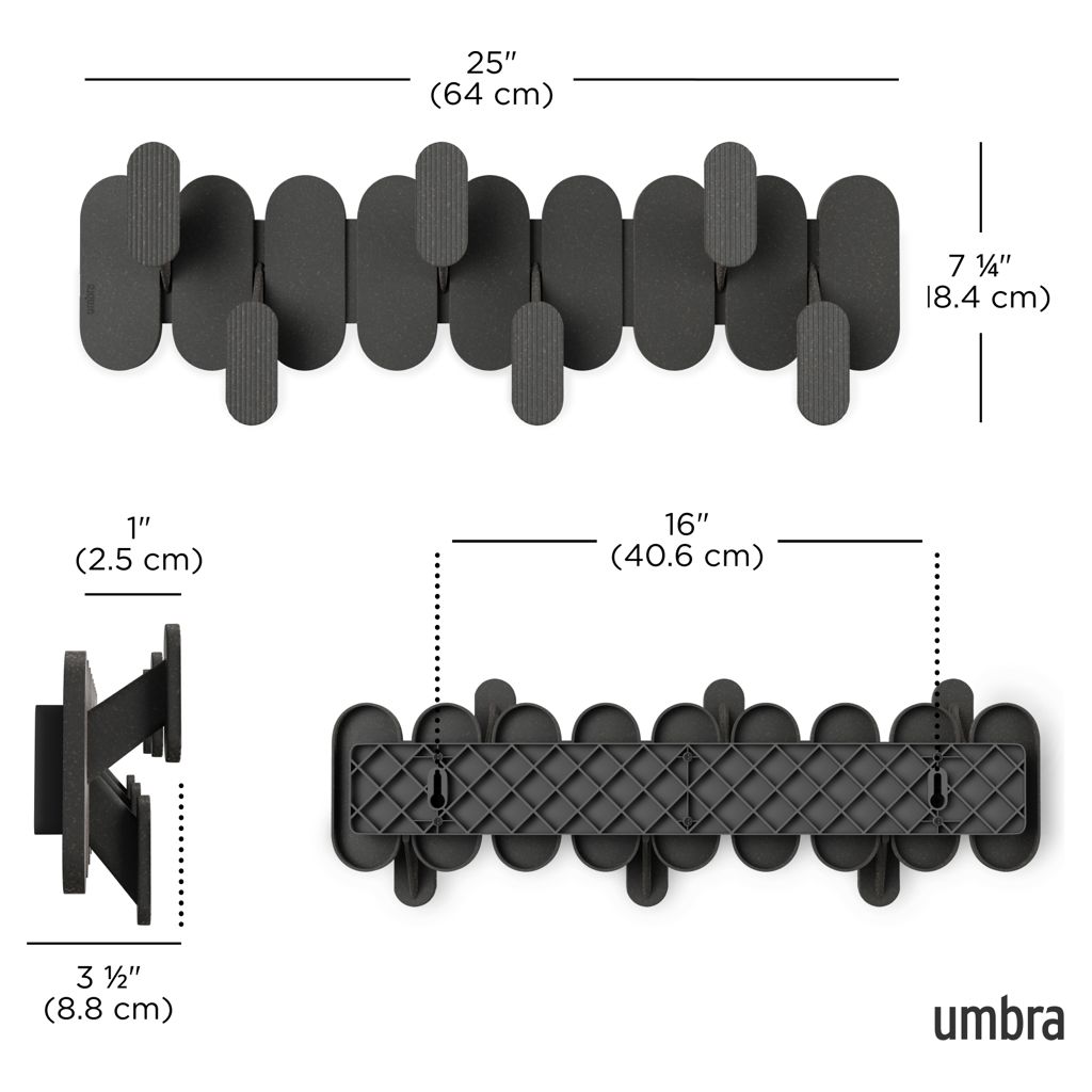Tempo 6 Hook allie style moderne et fonctionnalité quotidienne dans une conception murale élégante. Ses six crochets décalés maximisent l'espace de suspension tout en créant un look graphique saisissant sur votre mur. Fabriqué à partir de plastique recyclé durable et léger mélangé à de la fibre de bois recyclée, Tempo ajoute une texture naturelle subtile qui s'harmonise avec divers espaces : des entrées et des chambres aux salles de bains et aux bureaux. Chaque crochet supporte jusqu'à 5 lb (30 lb au total), ce qui les rend parfaits pour les manteaux, sacs, serviettes, et plus encore.