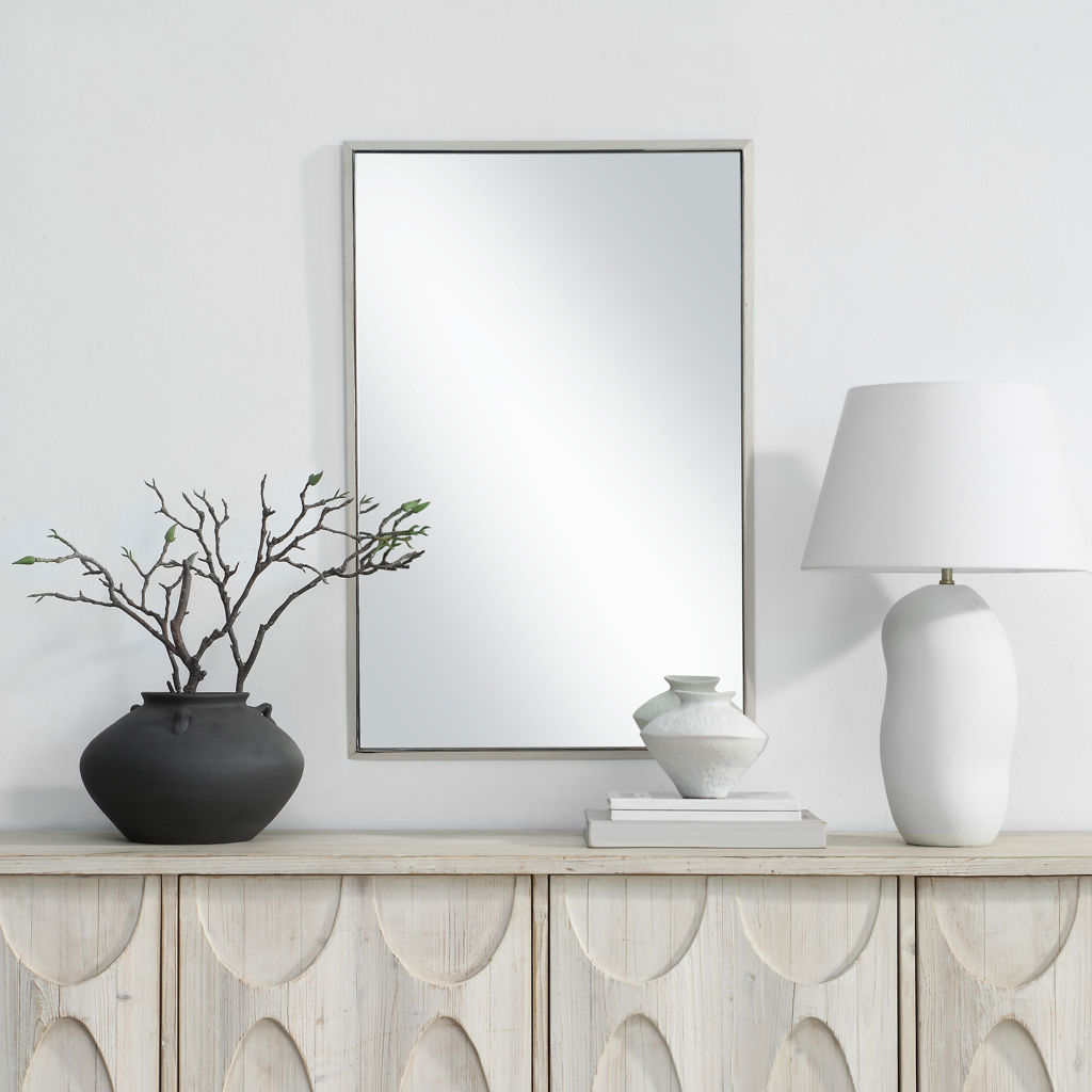 Fabriqué avec un cadre nickelé élégant et un verre miroir sans distorsion, son design simple convient bien aux espaces transitionnels ou contemporains.