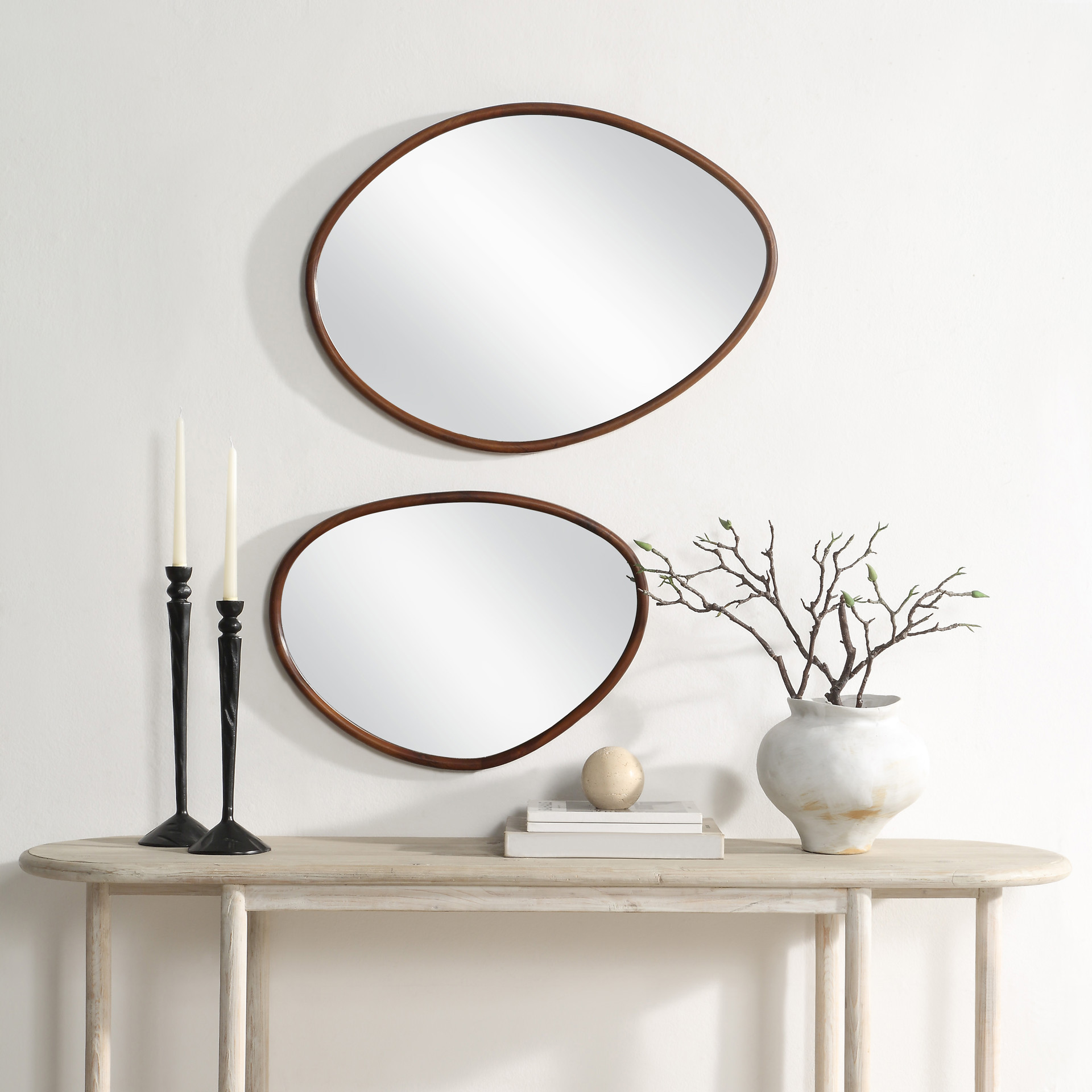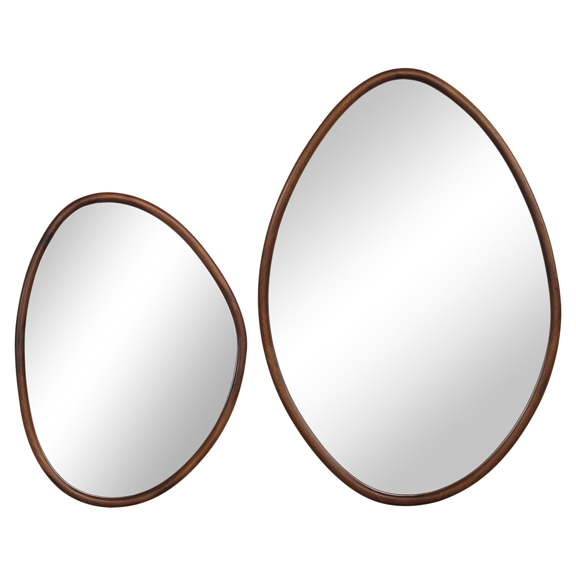 Redoublez l'impact de votre projet de décor intérieur avec ce duo de miroirs artisanal. De forme organique polie et d'un riche fini en noyer, leur esthétique du milieu du siècle s'adaptera à tout espace pour un attrait durable.