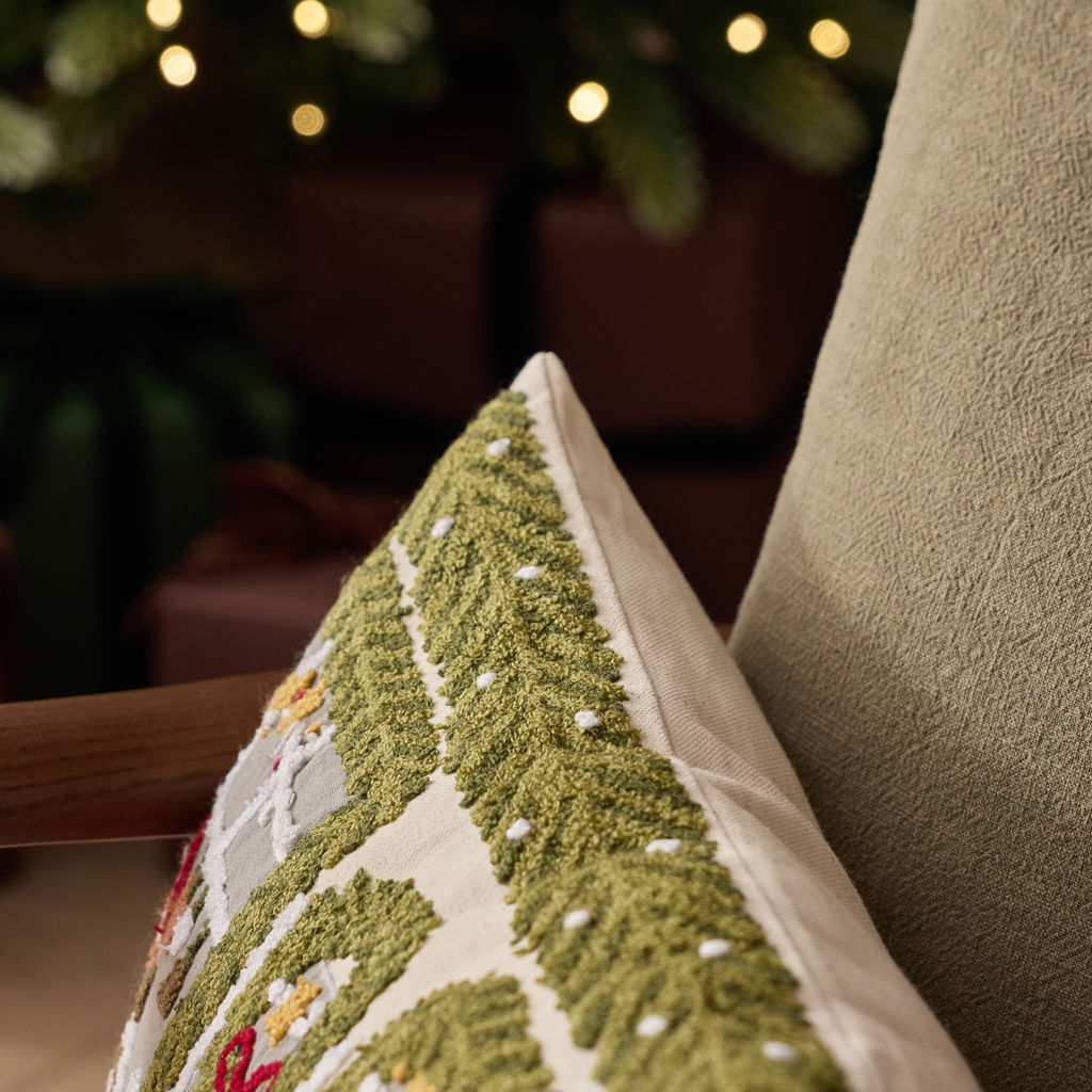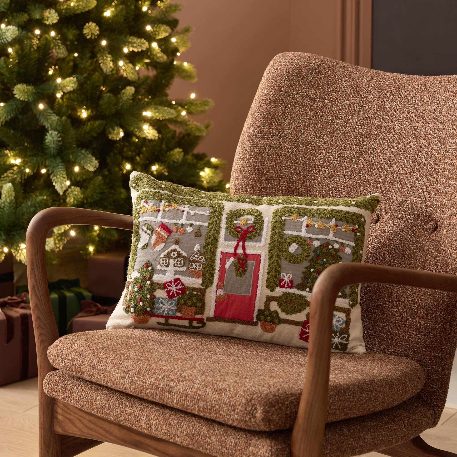 Une devanture de Noël brodée pleine de détails charmants qui rappellent la magie des vitrines festives.