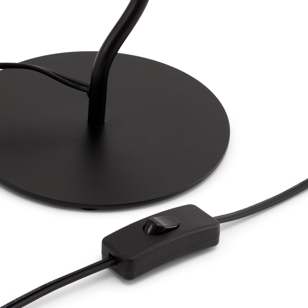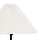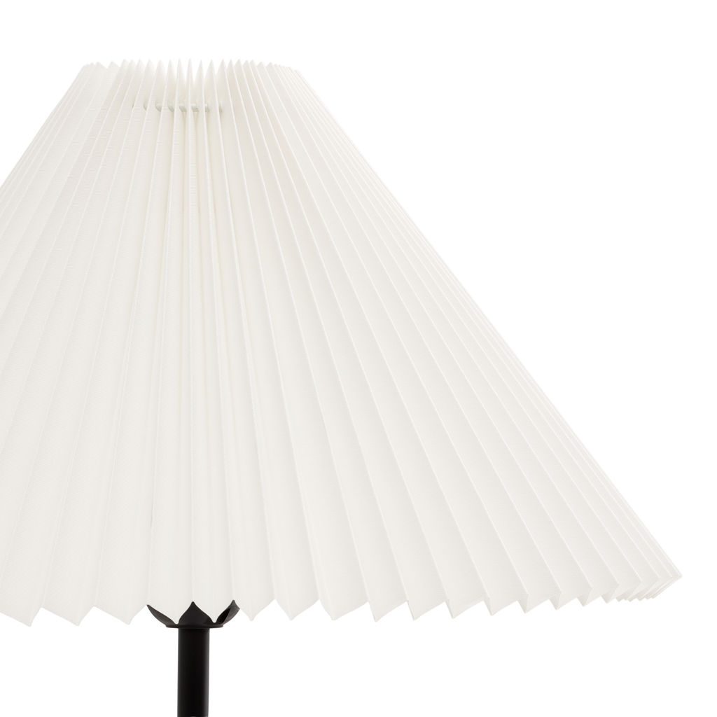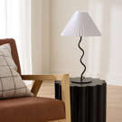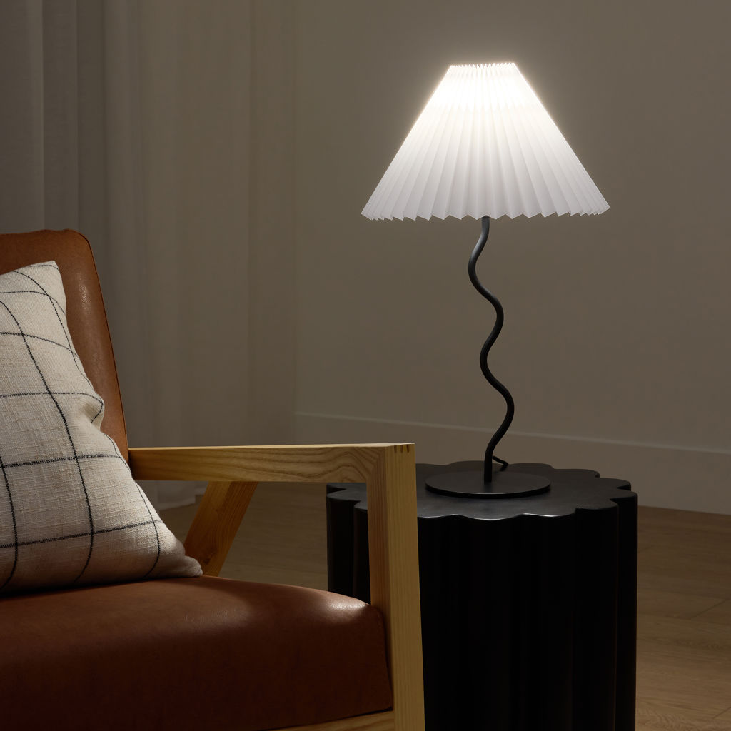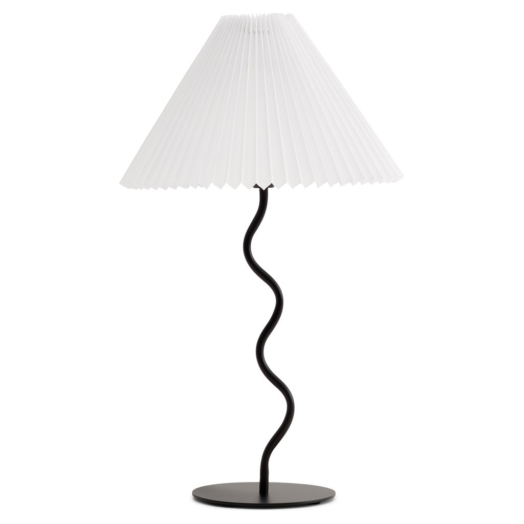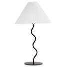 Cette lampe de table captive par sa silhouette sinueuse audacieuse où un pied métallique noir ondule élégamment comme une ligne tracée dans l'espace. Cette courbe organique contraste magnifiquement avec l'abat-jour plissé blanc qui déploie ses plis réguliers en éventail.