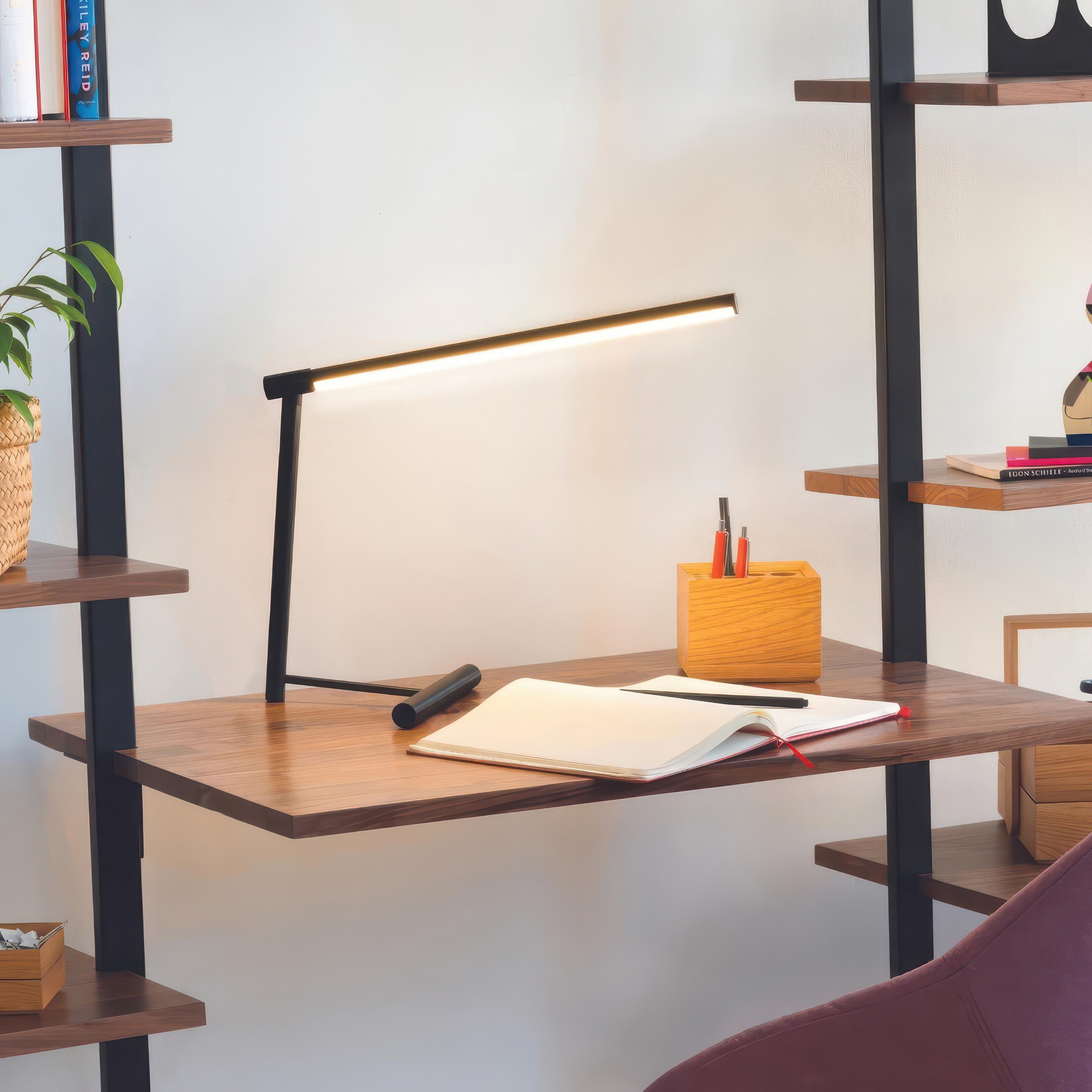 Simple et épurée, la lampe de table Slimline possède deux axes de rotation : le premier qui vous permet de faire pivoter sa tête et le second pour diriger l'éclairage à DEL d'un côté ou de l'autre.