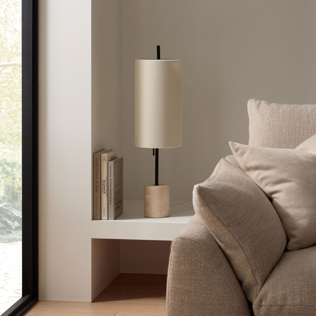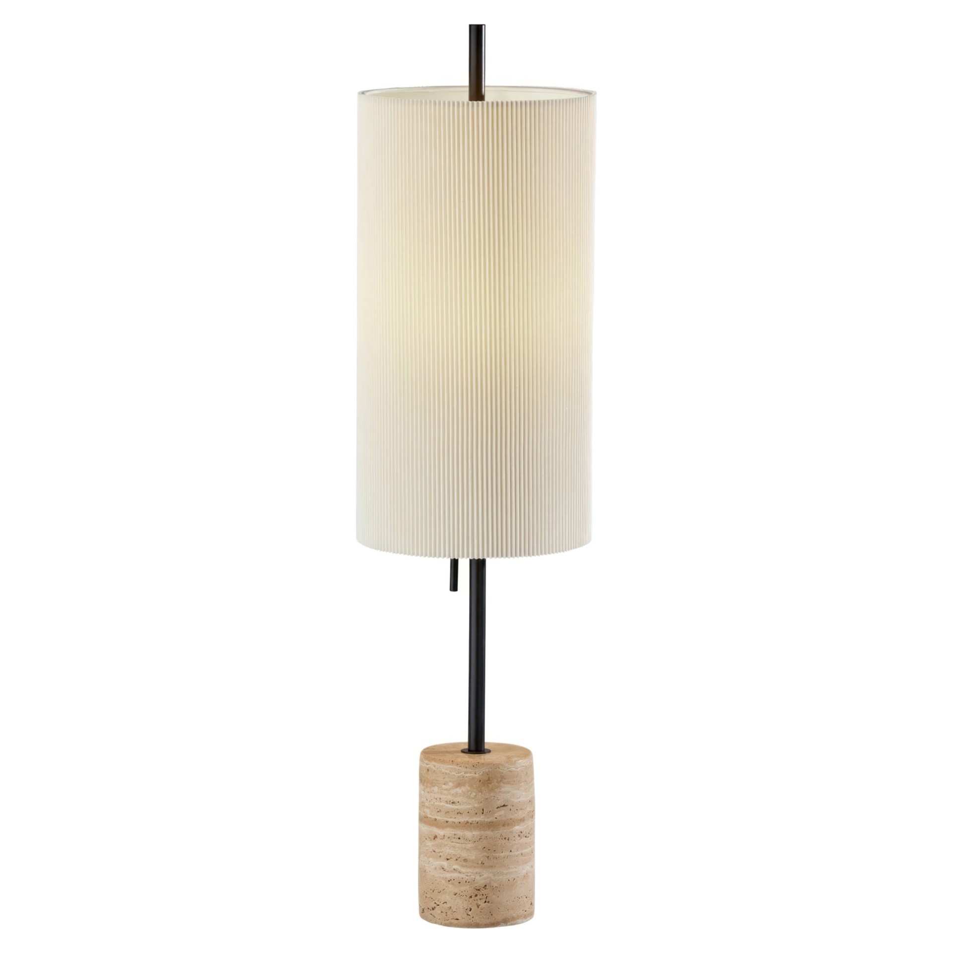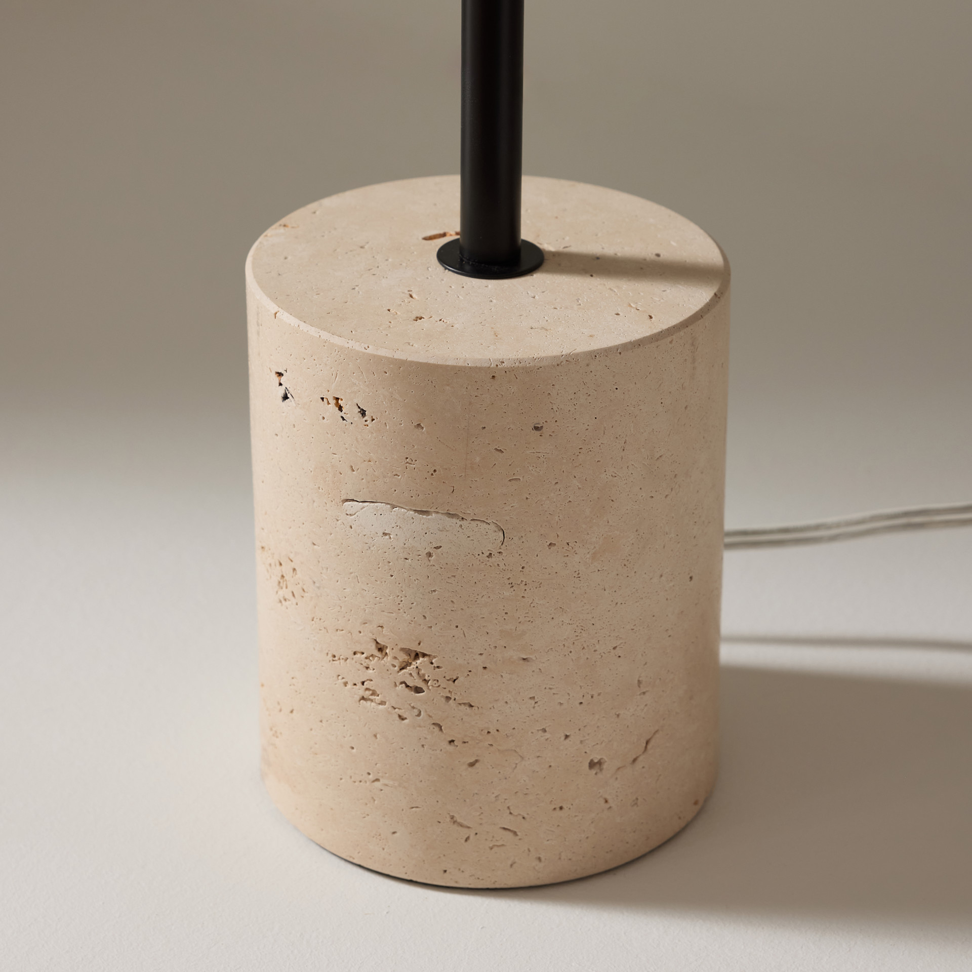 D'une hauteur de 30 pouces, la lampe de table devient un point focal élégant, soutenu par une base substantielle en pierre de travertin.