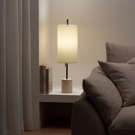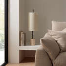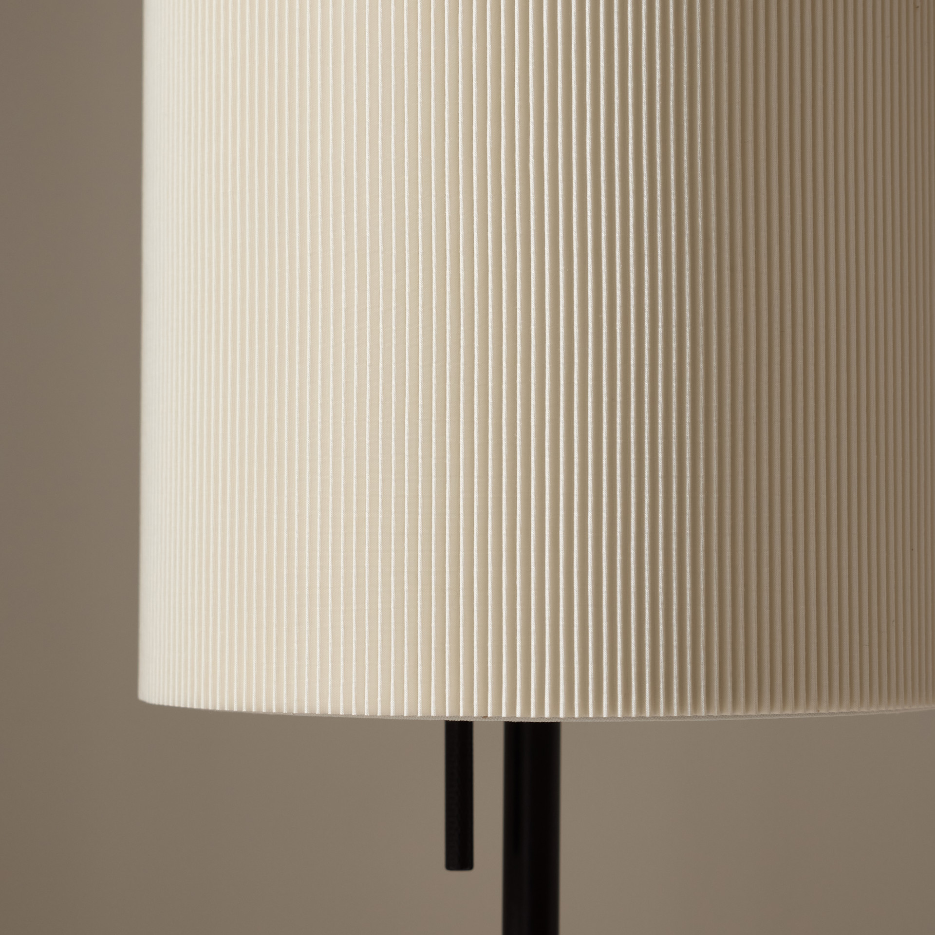 Son abat-jour en forme de tambour en tissu plissé blanc cassé dégage un charme intemporel.