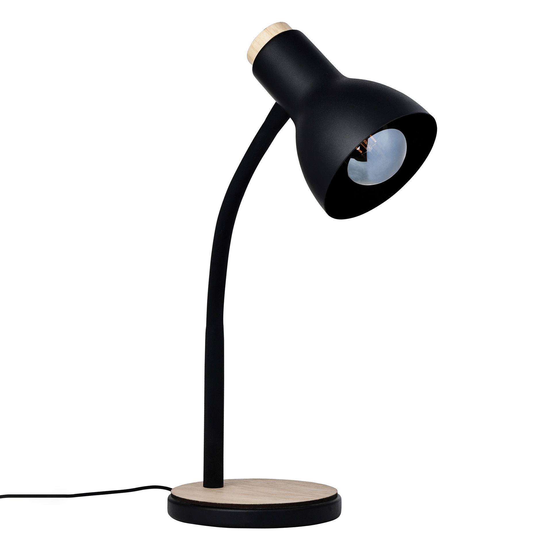 L´abat-jour en métal en forme de cloche s´adapte parfaitement à une base circulaire en bois, ce qui lui donne un look contemporain applicable dans divers environnements.