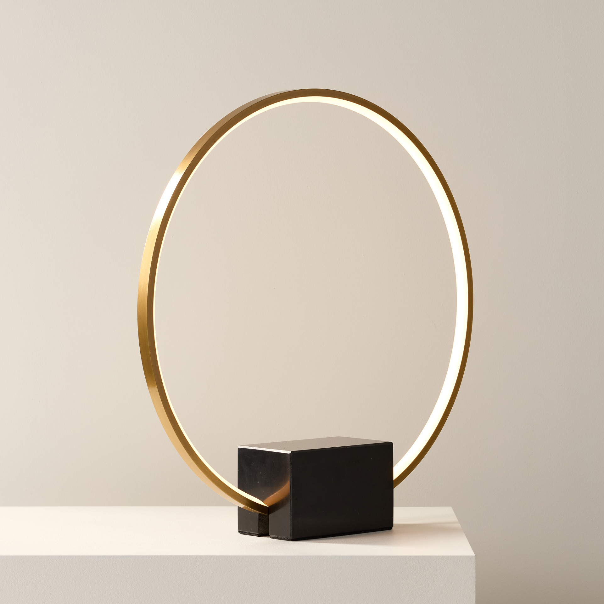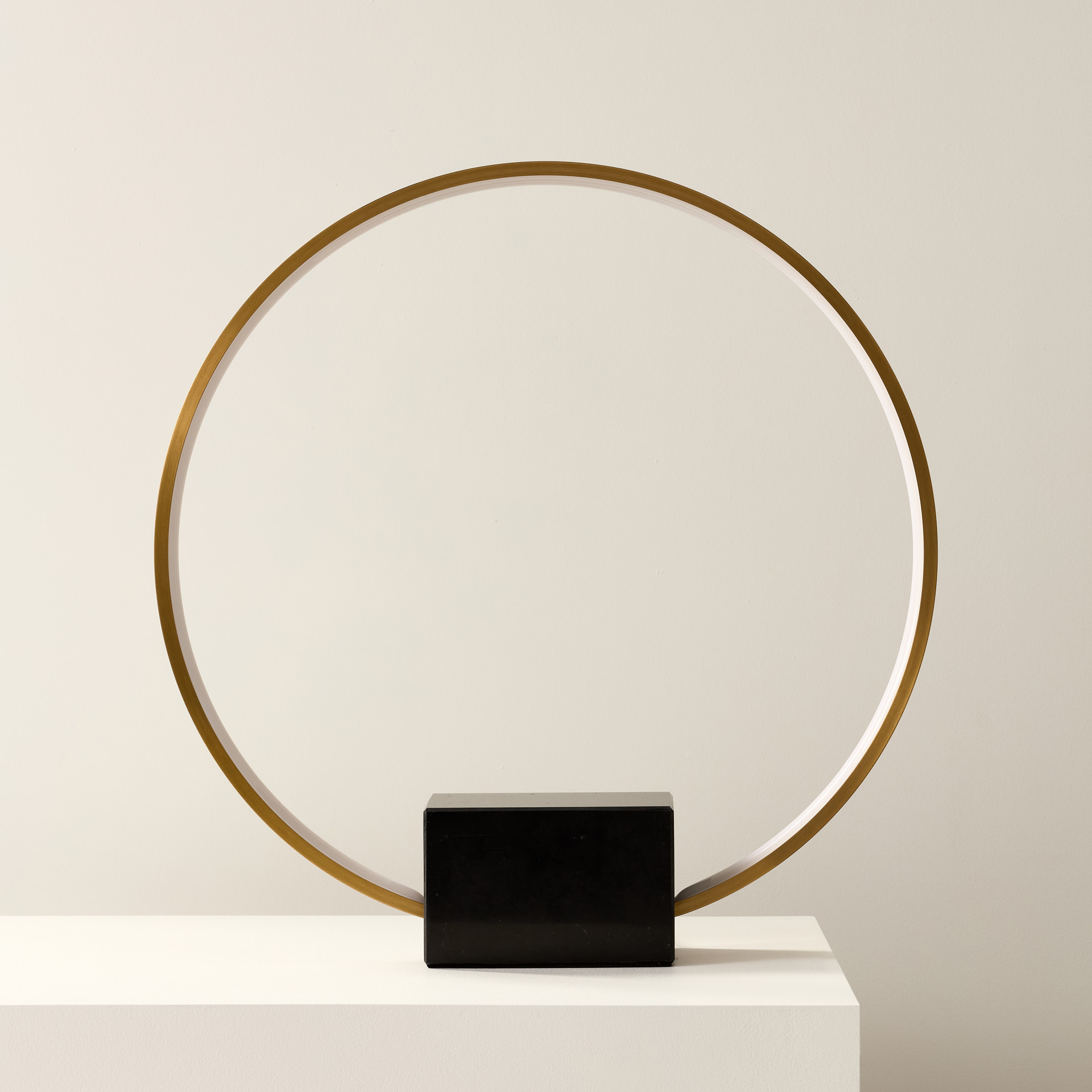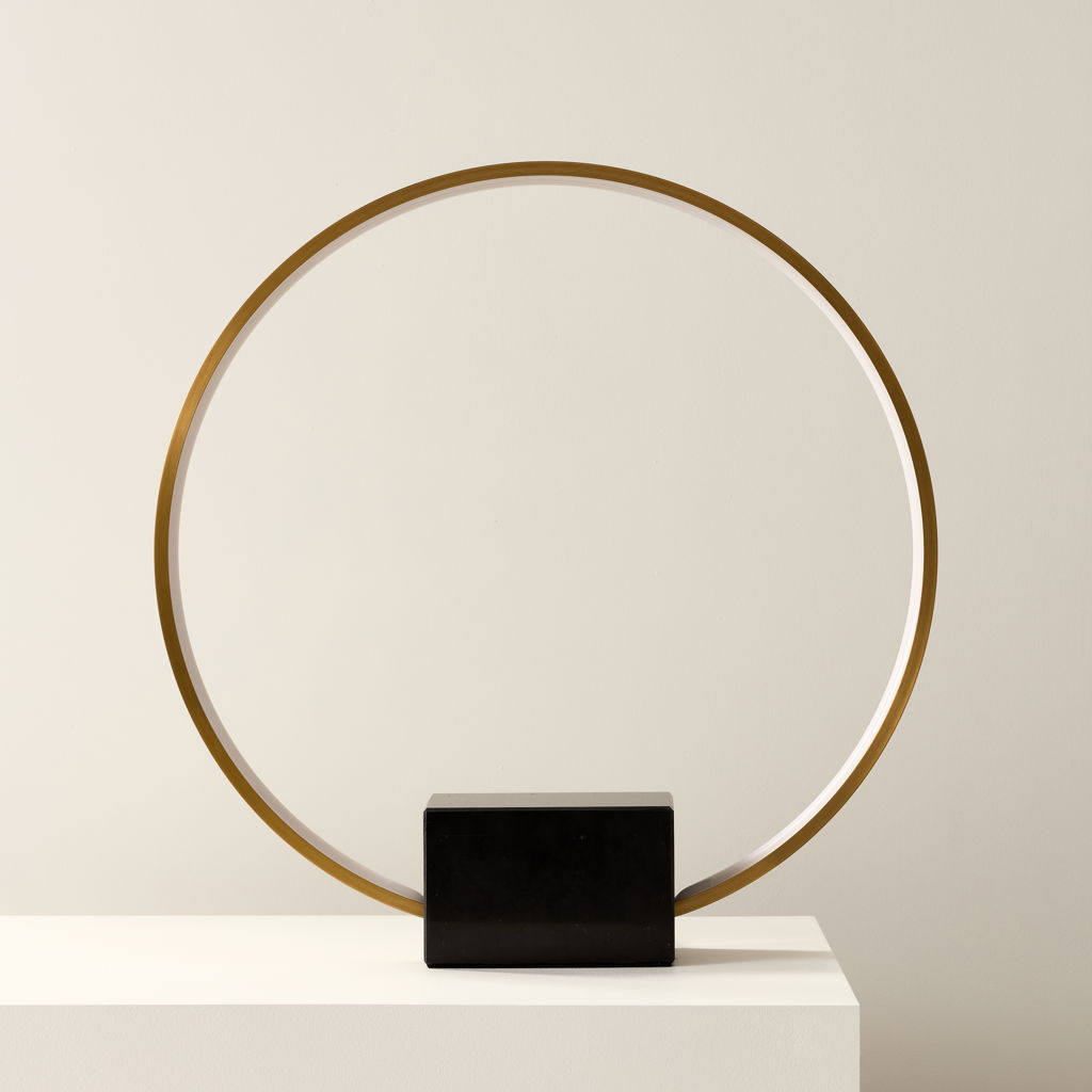 Cette lampe sculpturale réinvente l'éclairage décoratif avec son anneau lumineux qui semble flotter au-dessus d'une base en marbre noir. Une composition minimaliste qui transforme la lumière en œuvre d'art contemporaine.