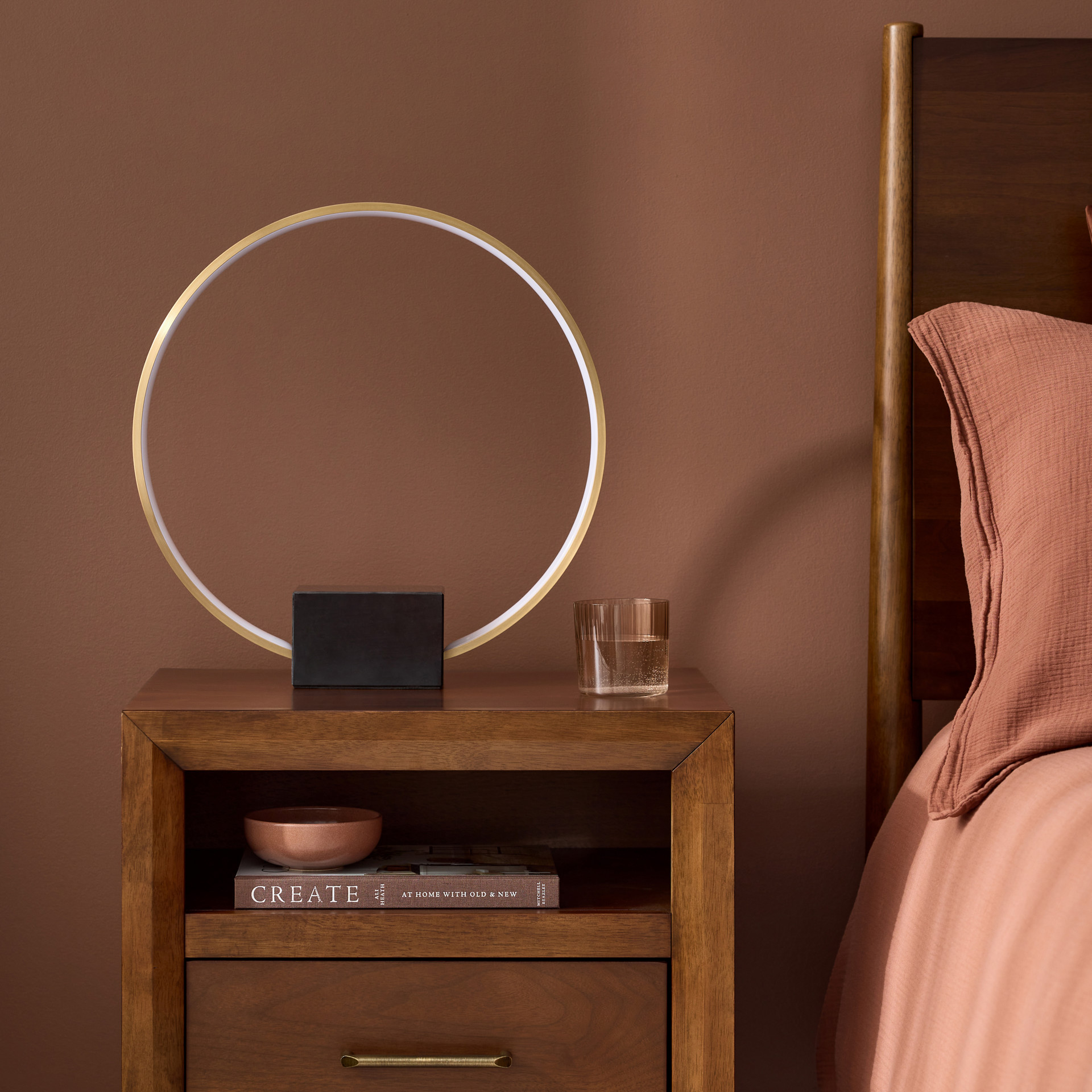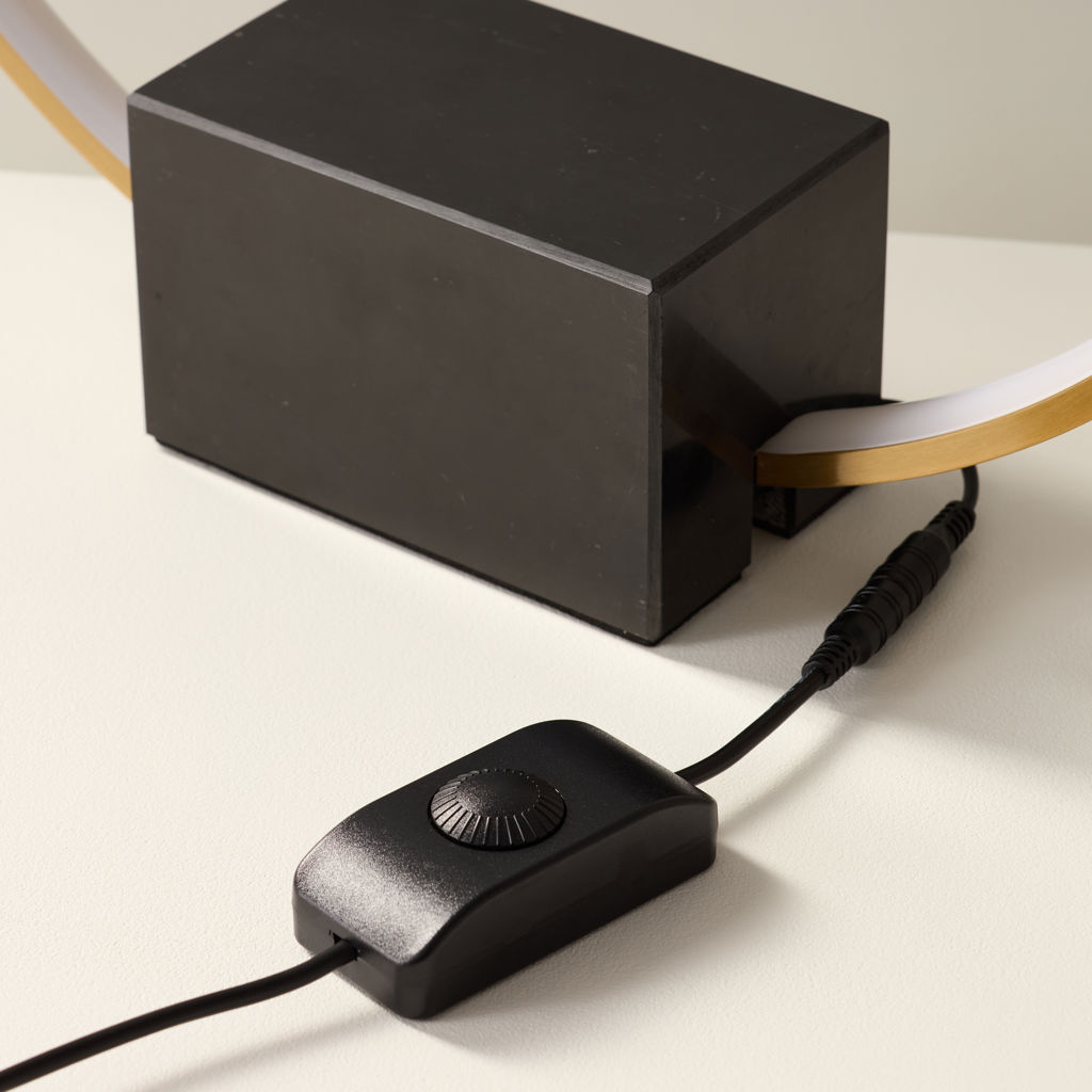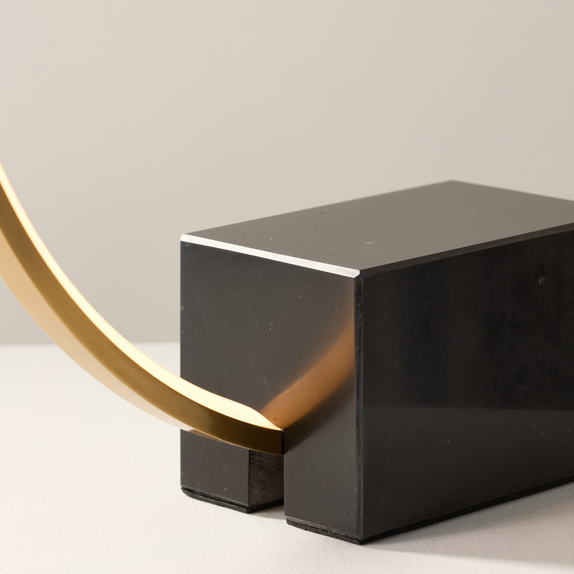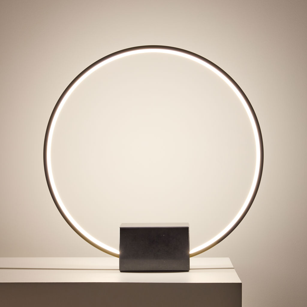 Cette lampe sculpturale réinvente l'éclairage décoratif avec son anneau lumineux qui semble flotter au-dessus d'une base en marbre noir. Une composition minimaliste qui transforme la lumière en œuvre d'art contemporaine.