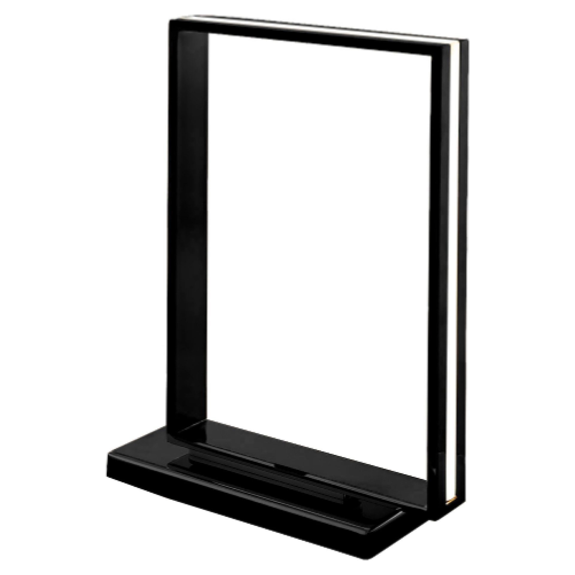 Cette lampe de table audacieuse réinvente l'éclairage avec son cadre rectangulaire noir qui intègre une bande LED le long de son périmètre. La structure métallique pivote sur sa base allongée, vous permettant d'orienter le cadre lumineux selon vos besoins ou vos envies déco.