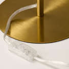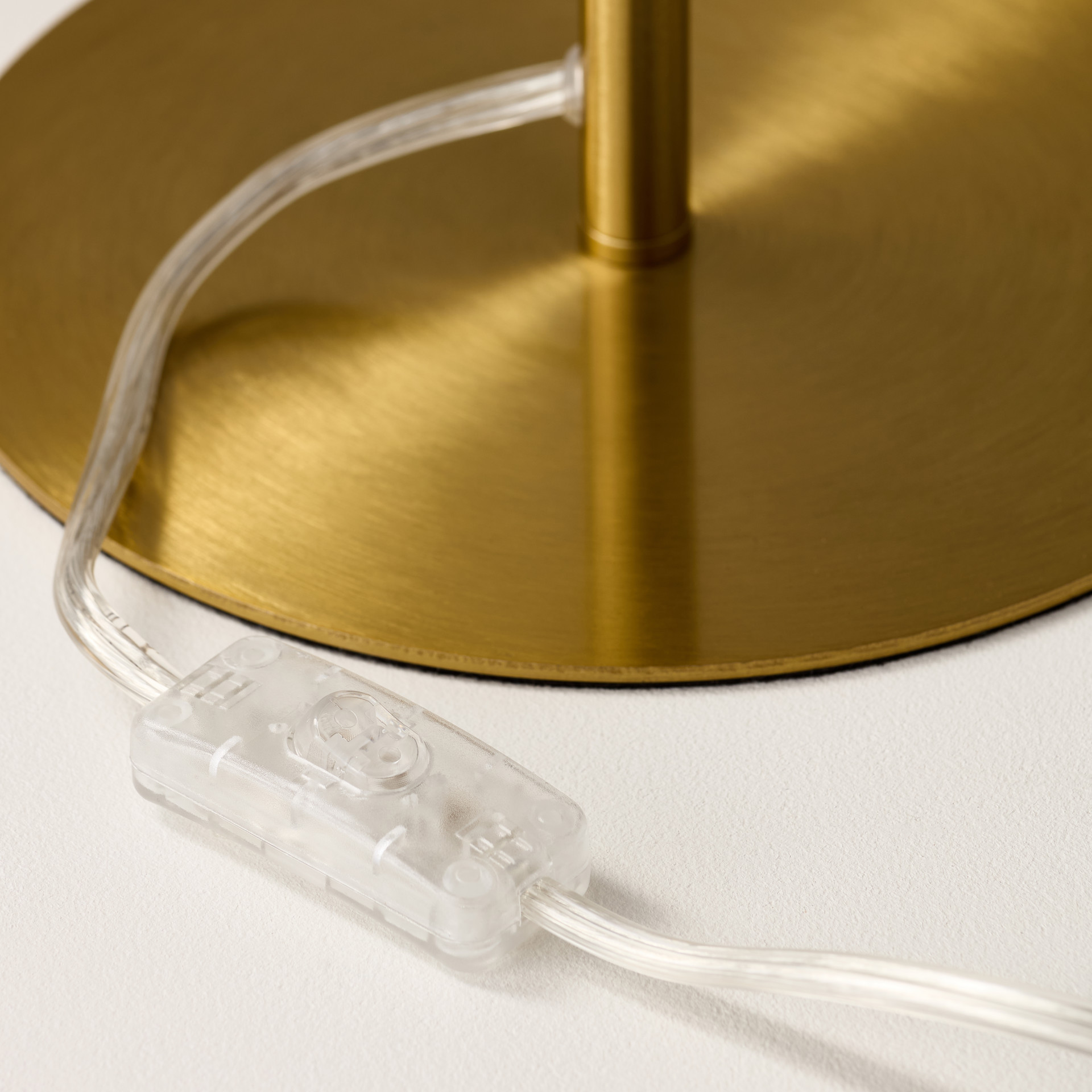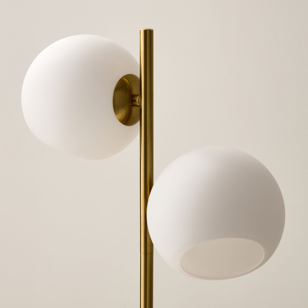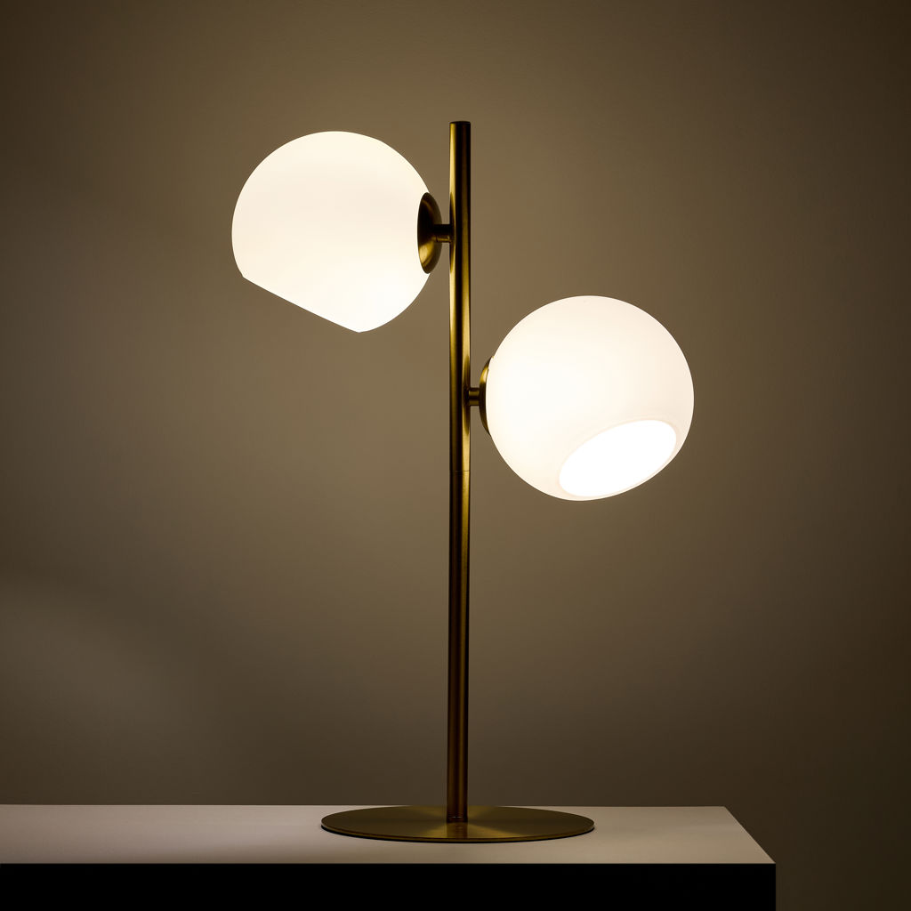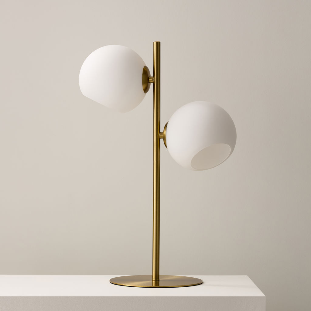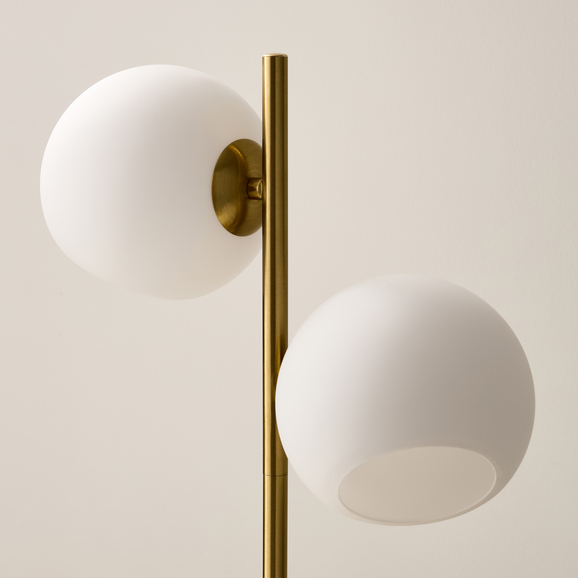 Cette lampe de table en métal à deux lumières présente des accents dorés et des globes en verre. Ses deux globes diffusent une lumière douce qui crée un effet de lumière ambiante et chaleureuse dans votre maison.
