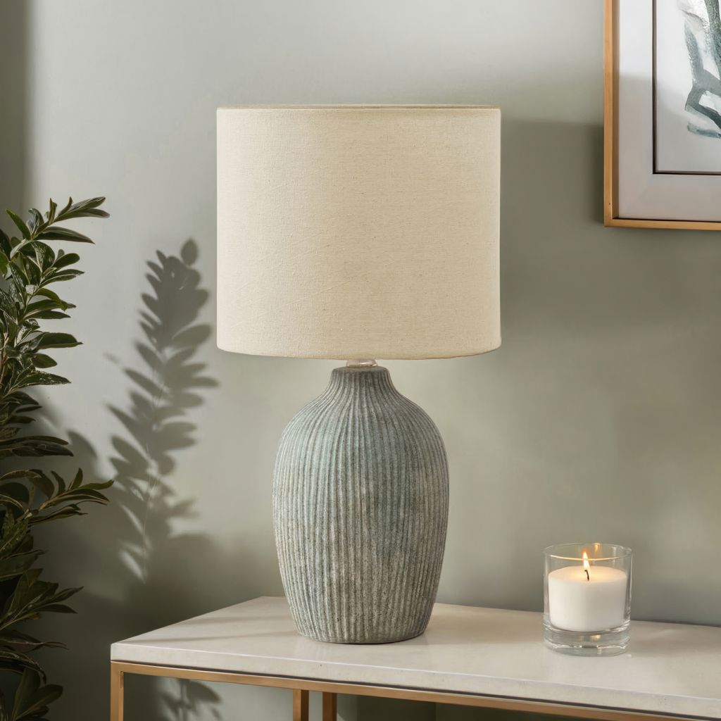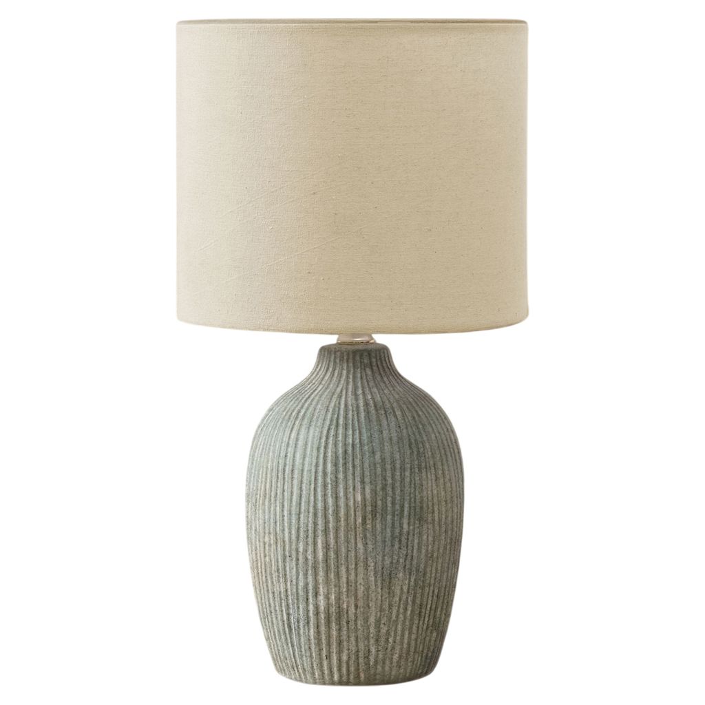 Conçue avec une sensibilité raffinée, cette lampe décorative présente une base en céramique verte avec des cannelures verticales texturées pour une déclaration sophistiquée dans le salon, la chambre ou le bureau à domicile.