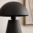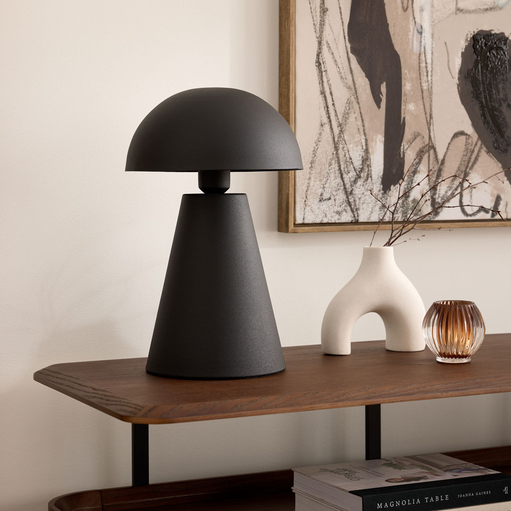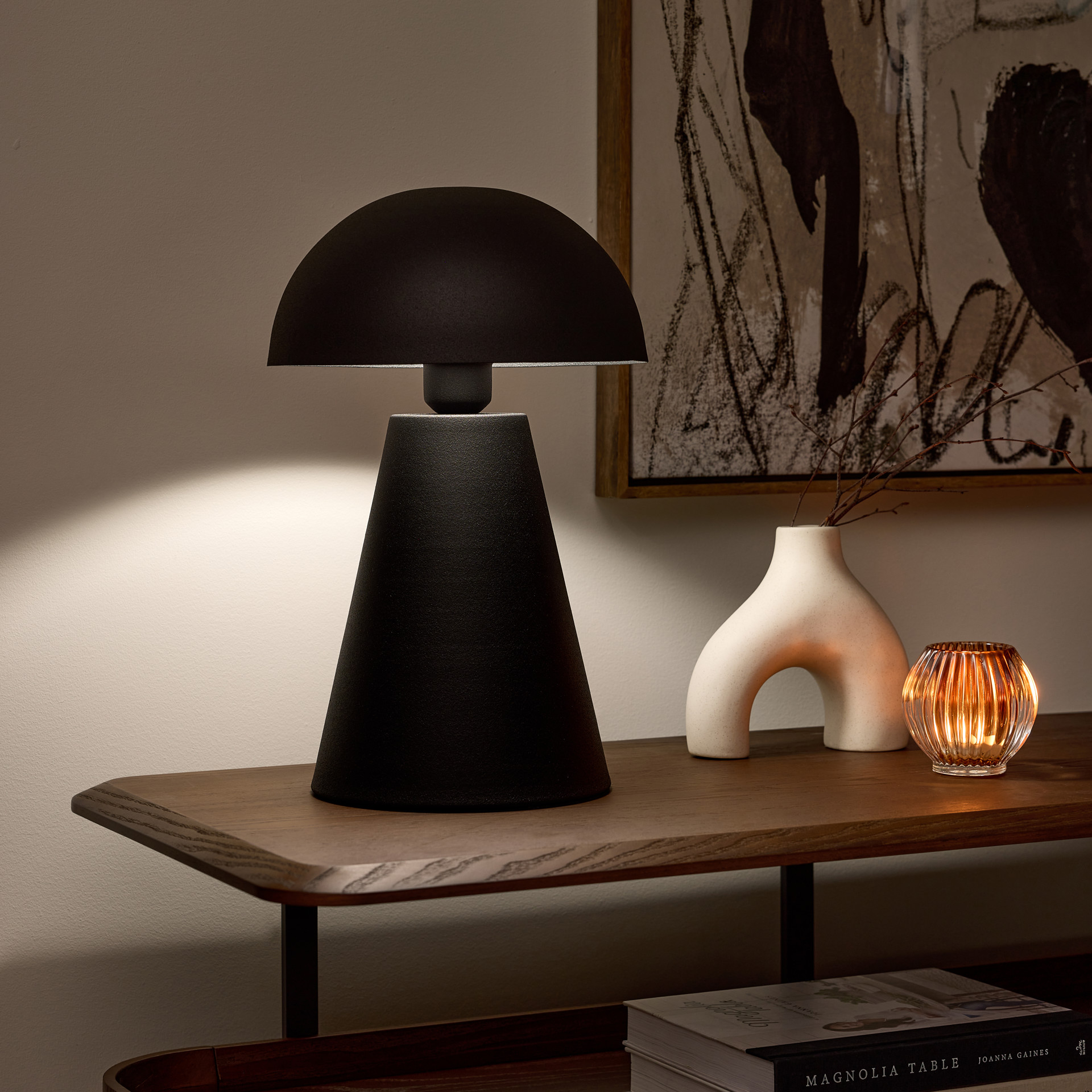 Cette lampe de table tout métal noir célèbre la force de la simplicité géométrique avec sa composition empilée de formes pures. Le pied conique évasé supporte une sphère intermédiaire qui s'épanouit sous un dôme généreux, créant une silhouette champignon sculptural remarquable.