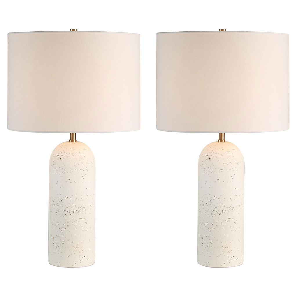 Créez une ambiance lumineuse et raffinée avec cet ensemble majestueux de deux lampes de table. Conçues pour marier style contemporain et charme classique, ces lampes se distinguent par leur base effet travertin au fini texturé et leur abat-jour en lin blanc cassé.