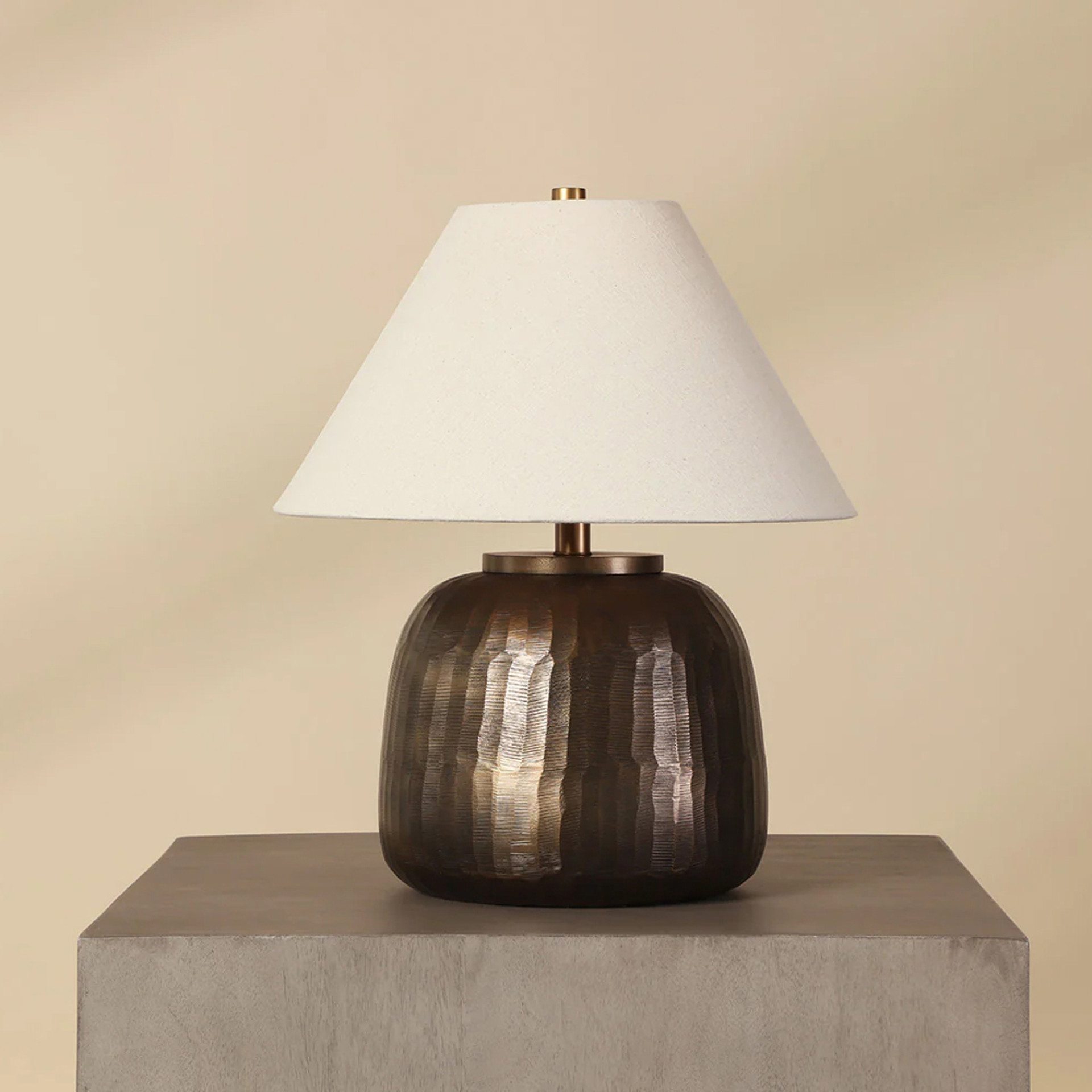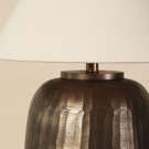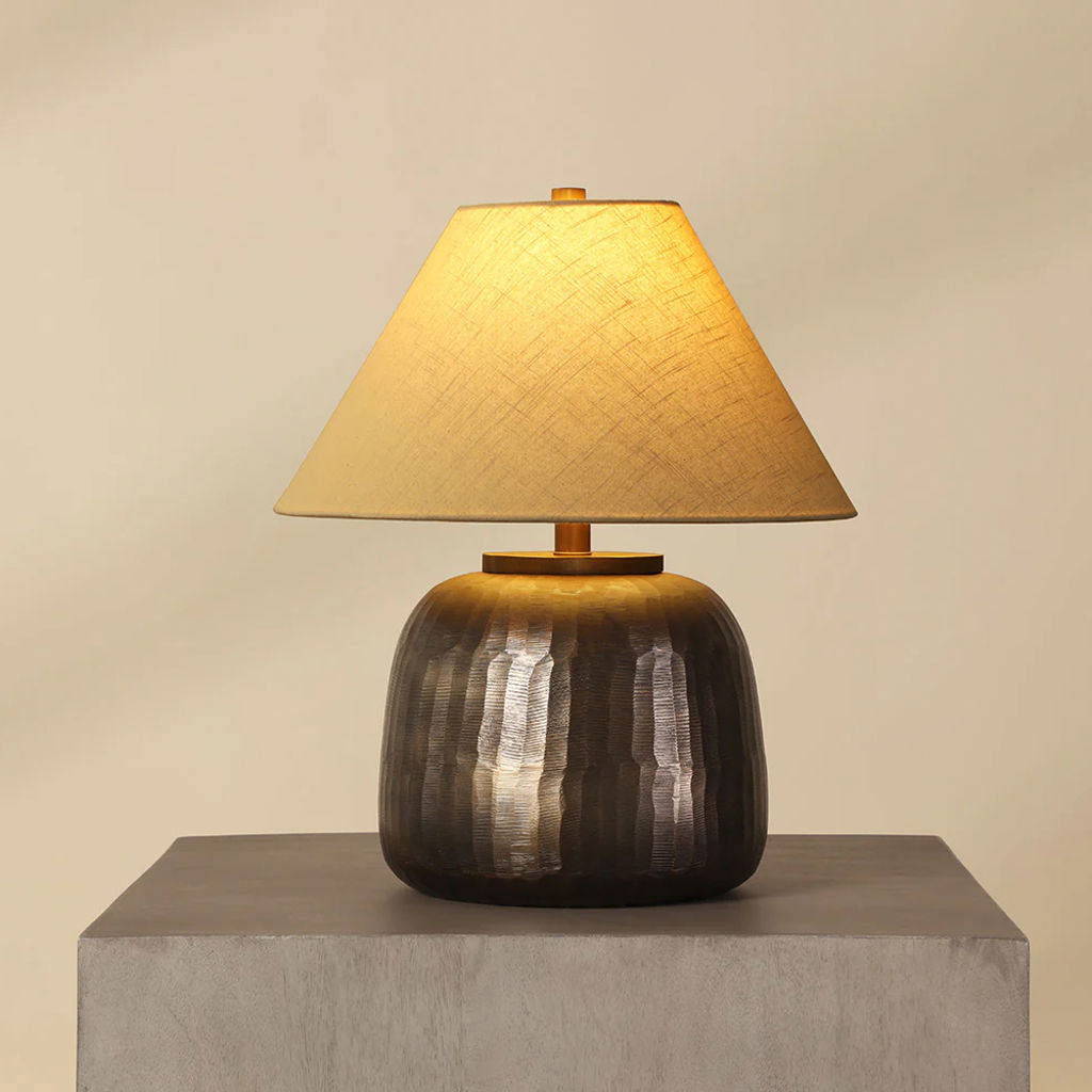 La lampe de table Pradiva est d'une expressivité discrète. Son pied arrondi en métal est martelé à la main, conférant à chaque courbe une qualité rythmique et tactile qui joue avec la lumière et l'ombre.