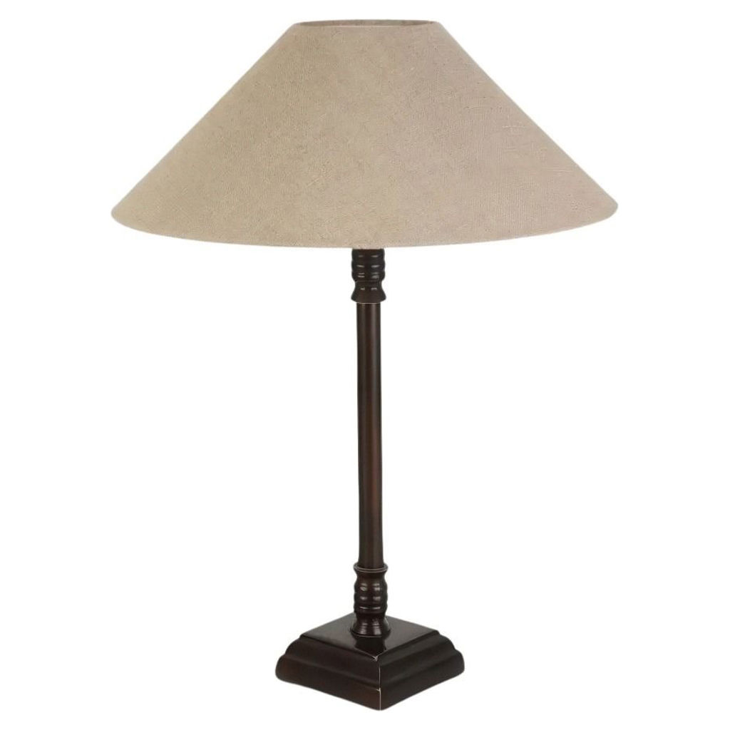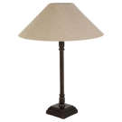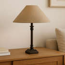 Une base en bronze noirci apporte de la structure, tandis que l'abat-jour en lin adoucit la forme et la lumière.