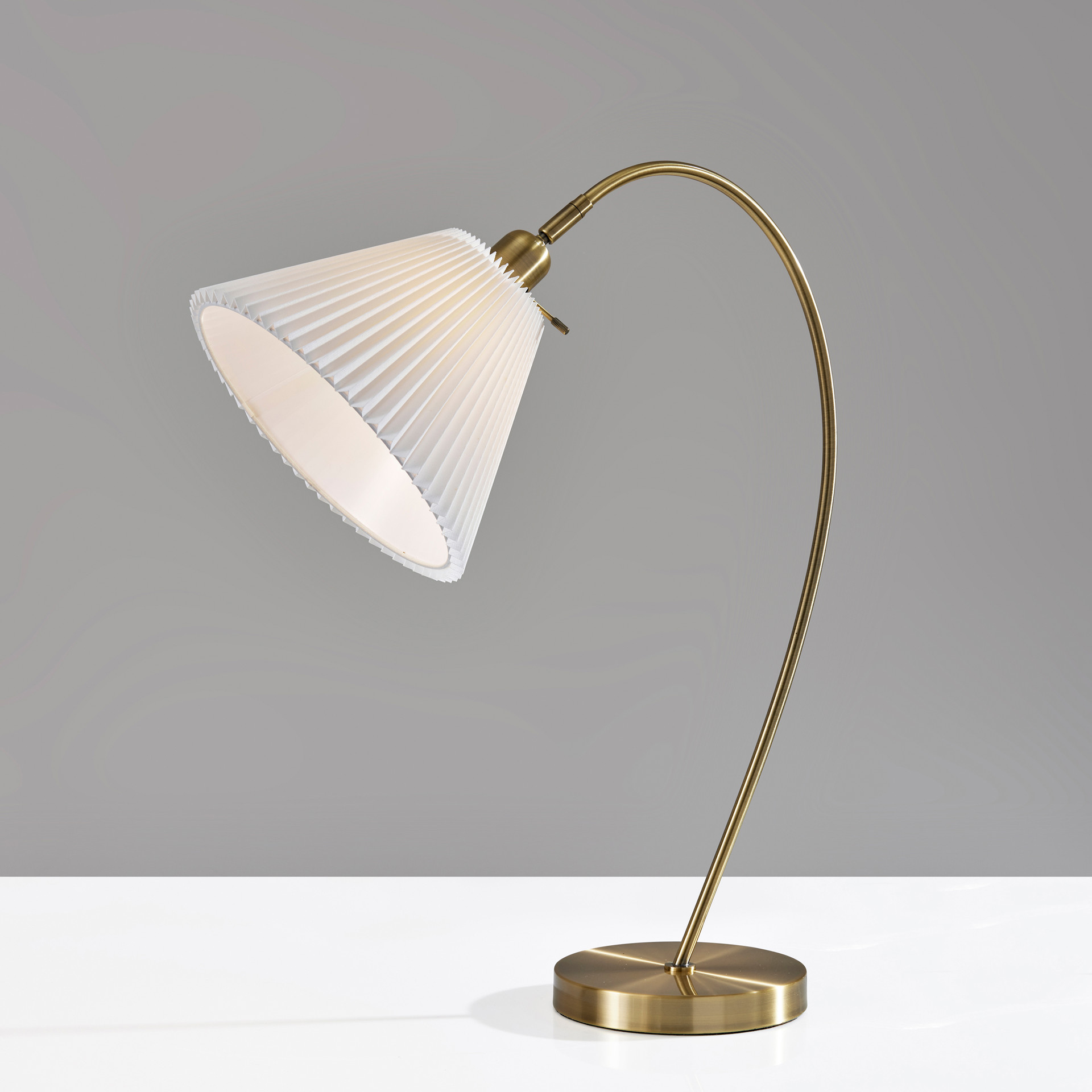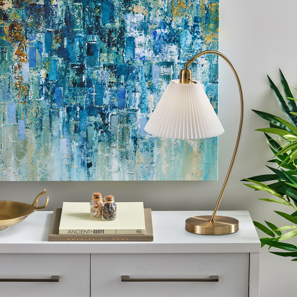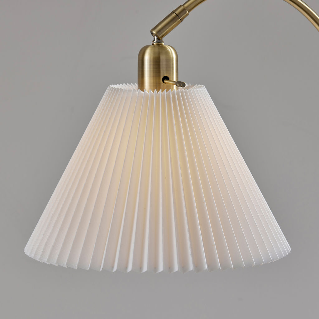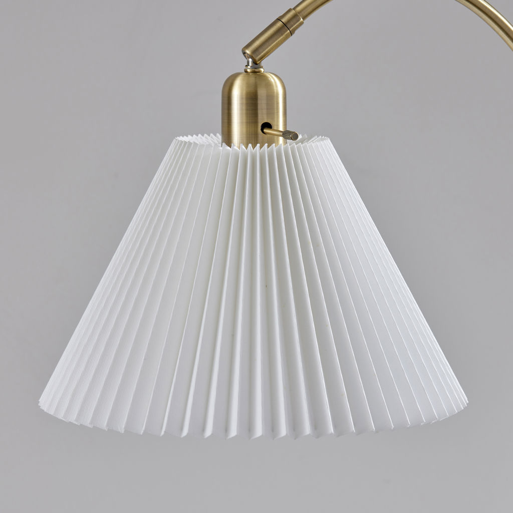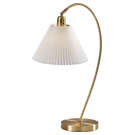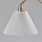 Son abat-jour plissé en tissu blanc cassé, légèrement effilé, diffuse la lumière avec douceur pour créer une ambiance chaleureuse et accueillante.