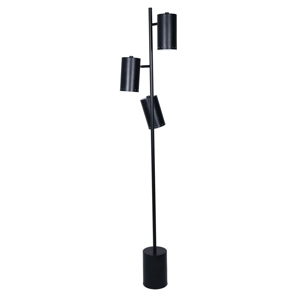Les abat-jours en métal noir mat attaché le long de la tige centrale ont un intérieur blanc pour maximiser la luminosité de chaque lumière.