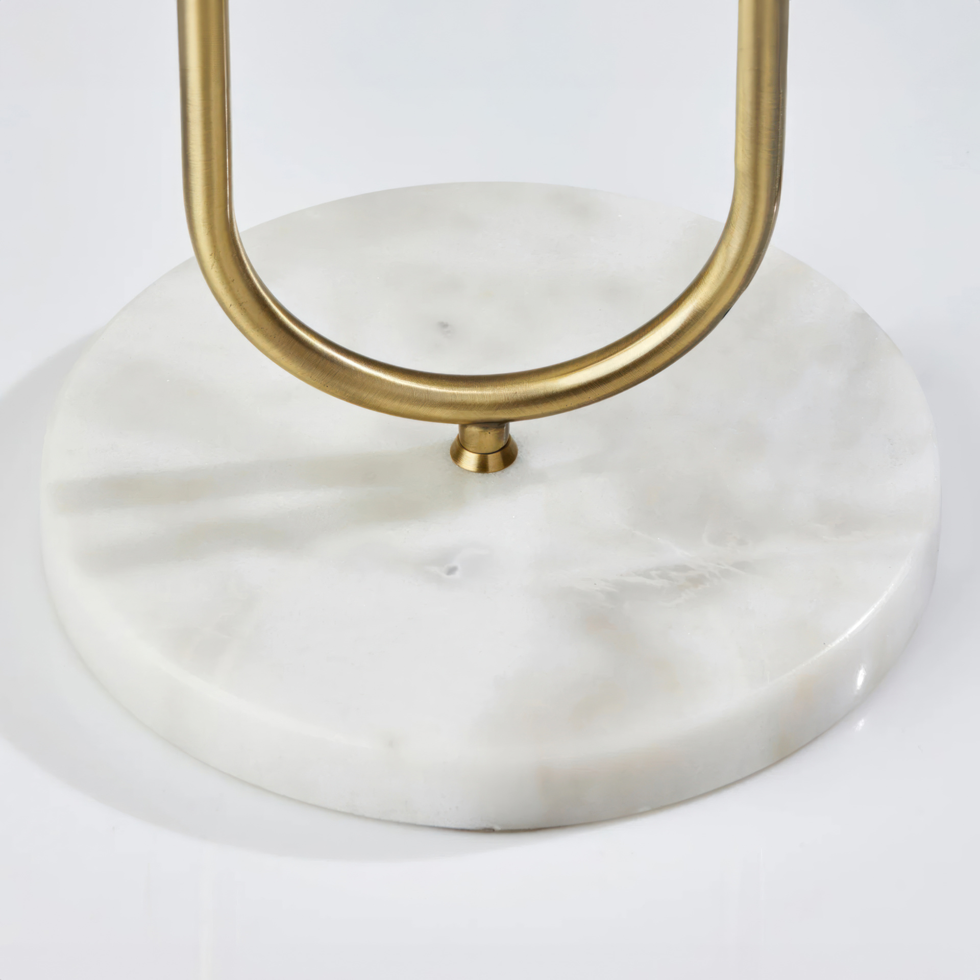 Cette lampe présente une finition en laiton antique qui s'harmonise magnifiquement avec sa base en marbre blanc, évoquant un sentiment d'élégance et de caractère.