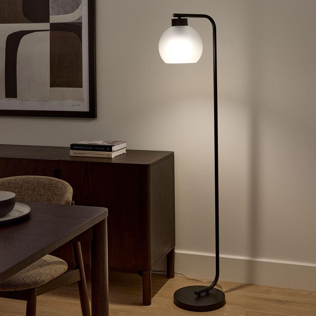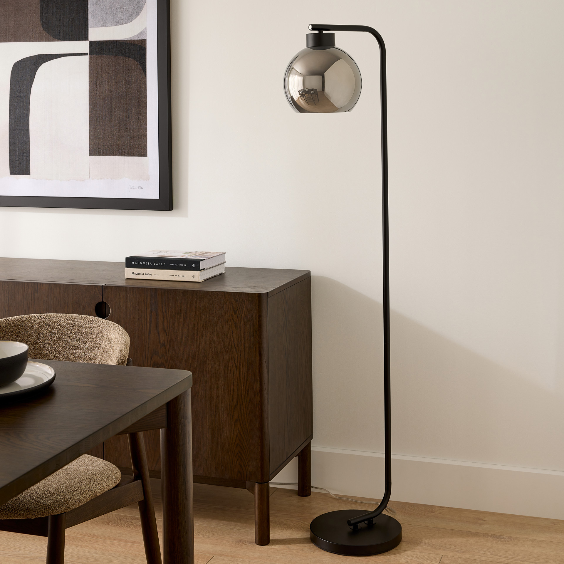 Finie en noire, élégante et dotée d'un abat-jour en verre fumé en forme de globe, cette lampe dégage une élégance moderne. L'extérieur brillant de l'abat-jour associé à son intérieur givré crée un contraste captivant, projetant une lueur douce et invitante.