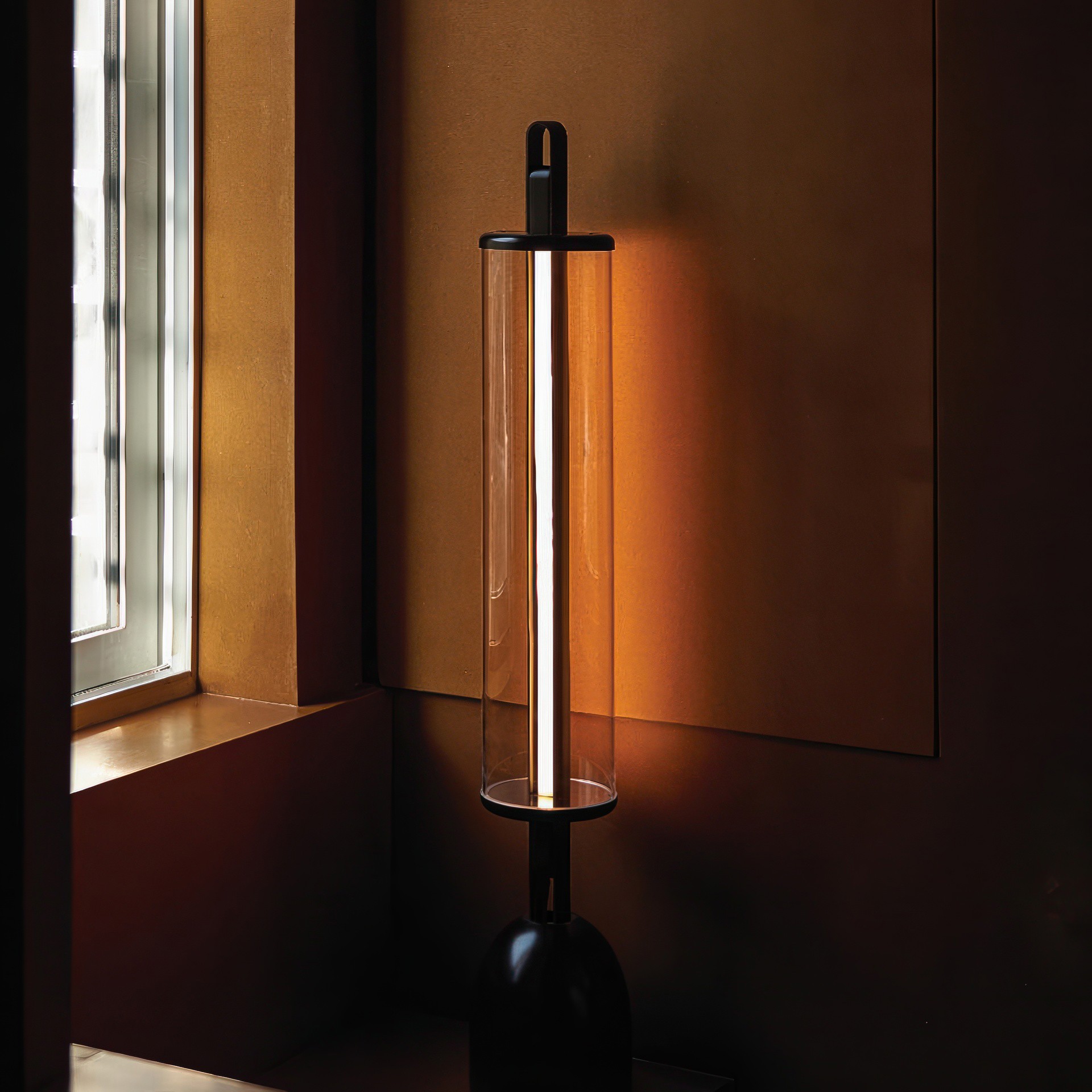 La délicate bande en métal noir traverse le verre cylindrique, dissimulant subtilement la source lumineuse.