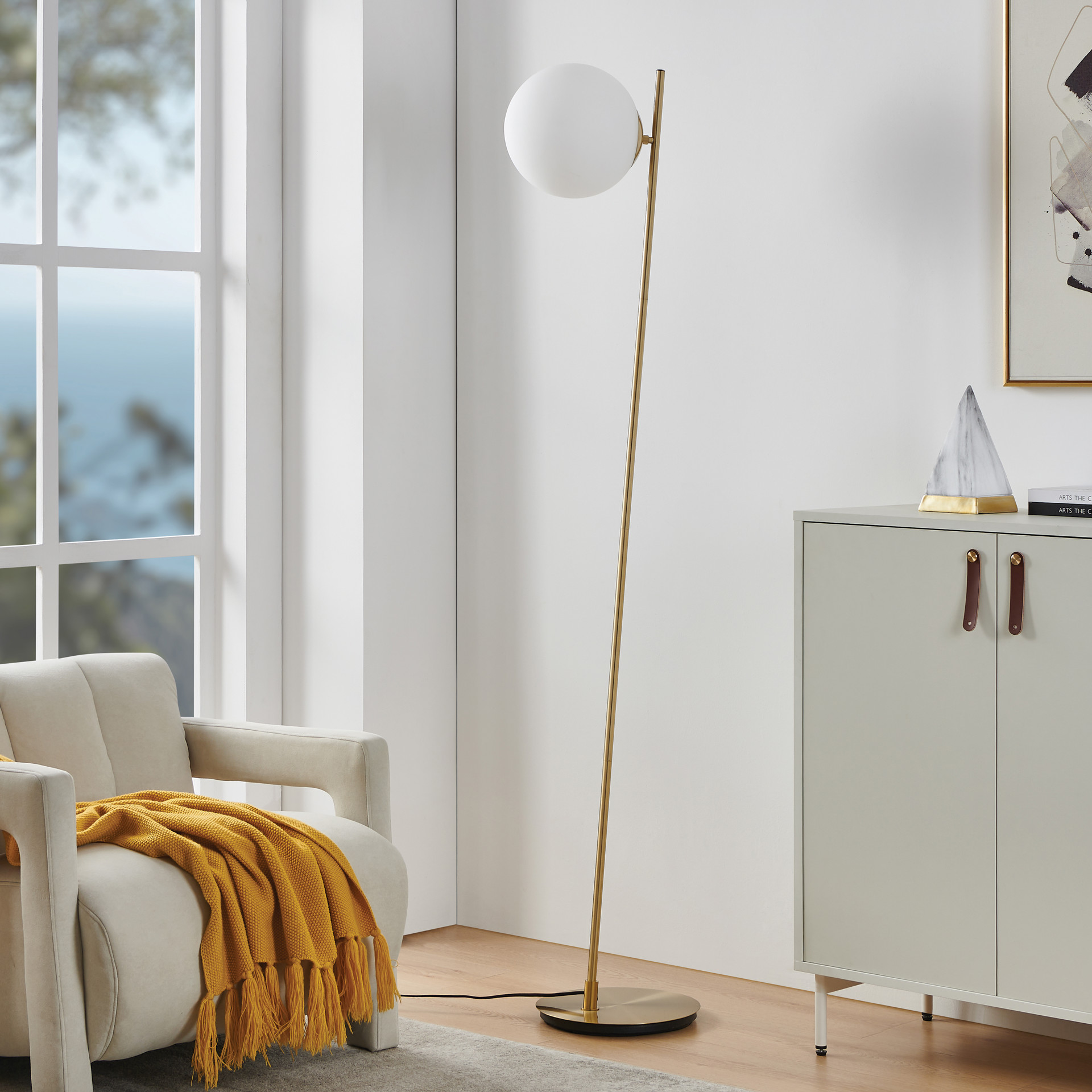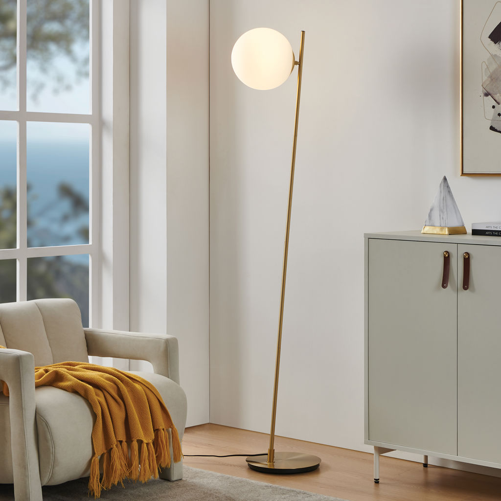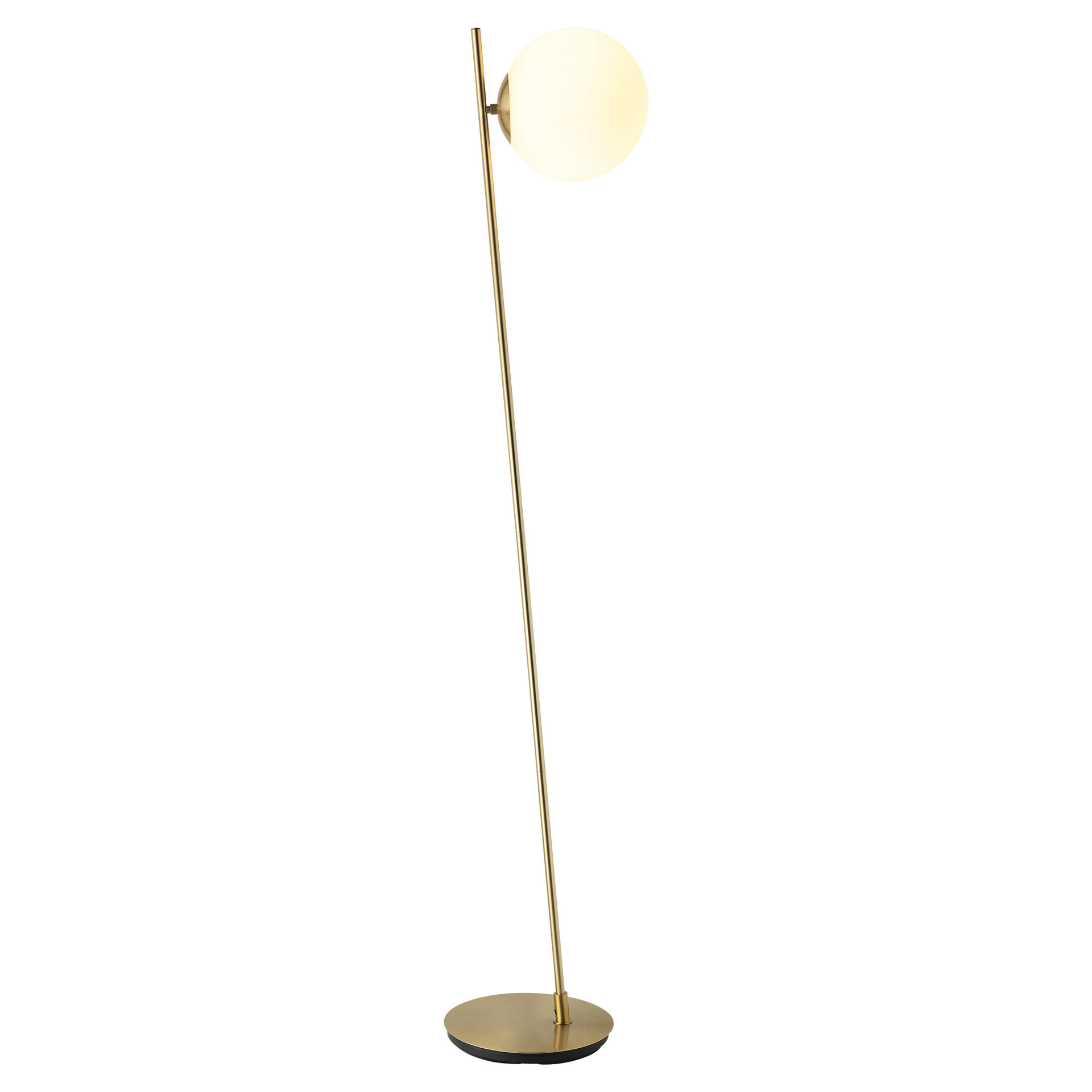 La lampe de plancher Rondo se compose d'une base ronde plate en métal doré avec une tige fixée à un angle dynamique et d'une boule de verre blanc.
