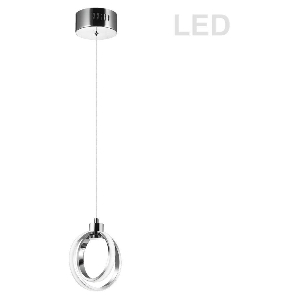 Cette lampe suspendue joue avec la géométrie circulaire à travers deux anneaux chromés imbriqués qui créent une composition sculpturale captivante. La technologie LED intégrée illumine ces cercles métalliques pour diffuser une lumière contemporaine et uniforme.